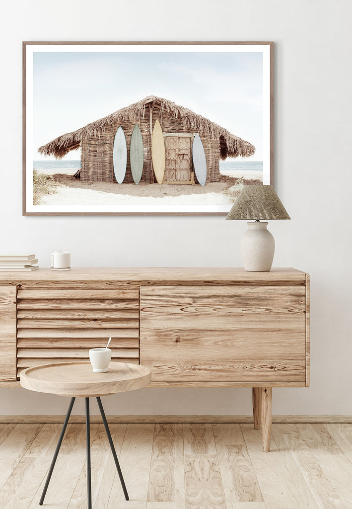 This photograph of a beach hut, bathed in soft neutral tones, captures the serene beauty of coastal life. The gentle hues of beige and cream highlight the hut’s rustic charm, creating a peaceful, tranquil atmosphere.