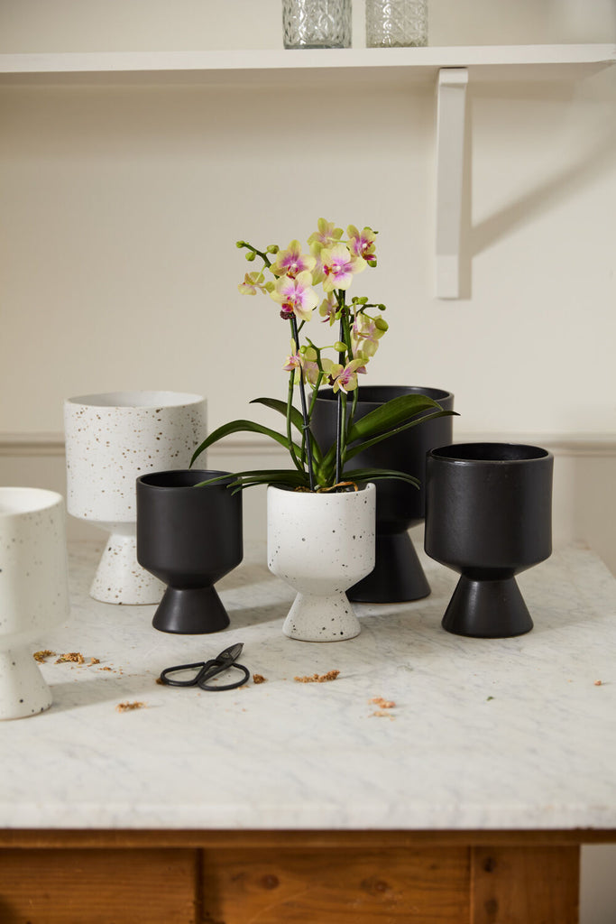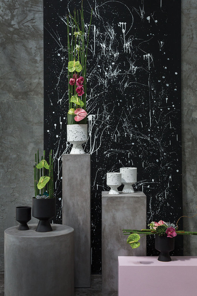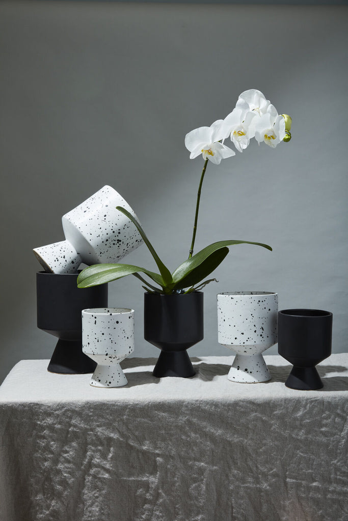 The DeVil pot is unique from silhouette to finish. The vase is first glazed, before speckles are applied by flicking glaze onto the pot by hand.