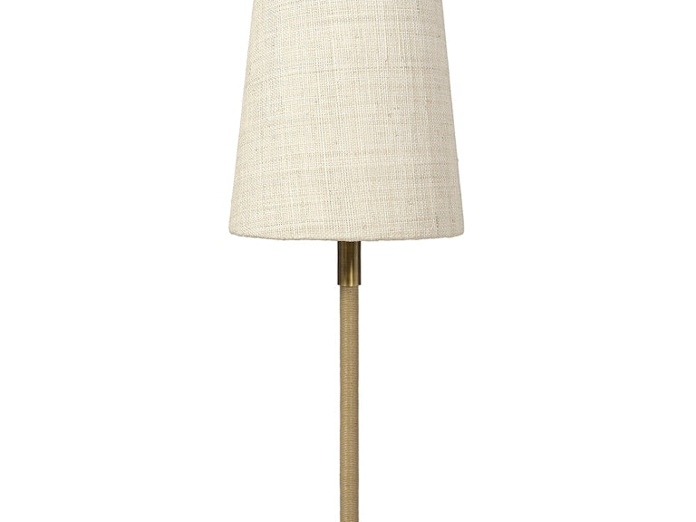 Brass and metal body, features tan leather hand-wrapped pole accented with antique brass details and hardware topped with a natural raffia shade.