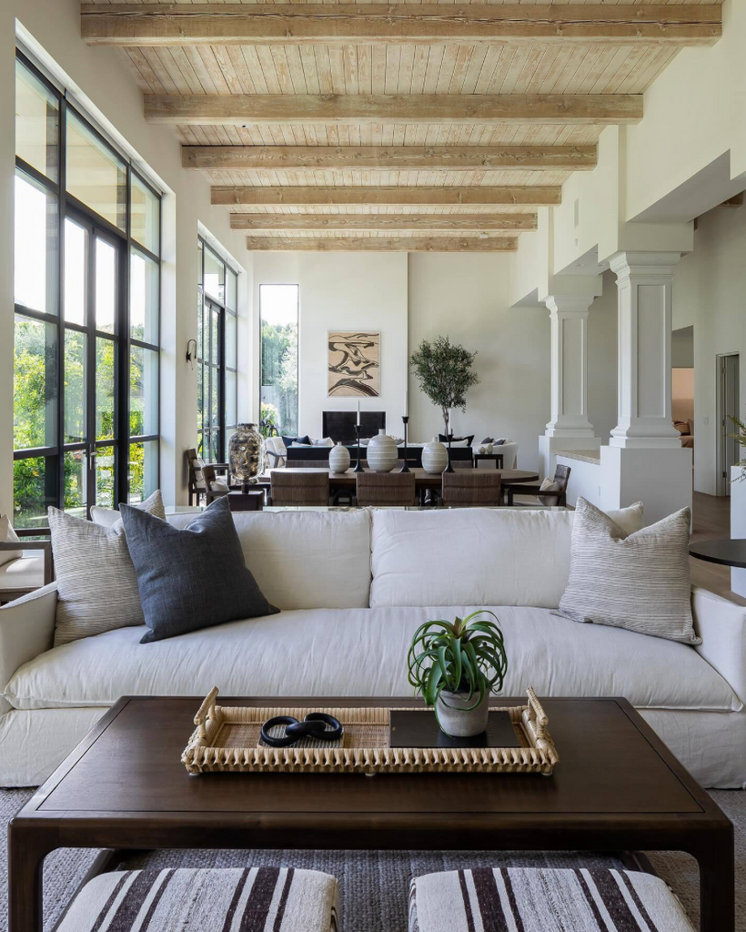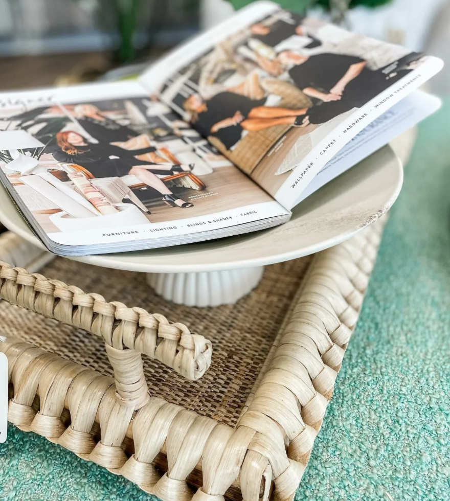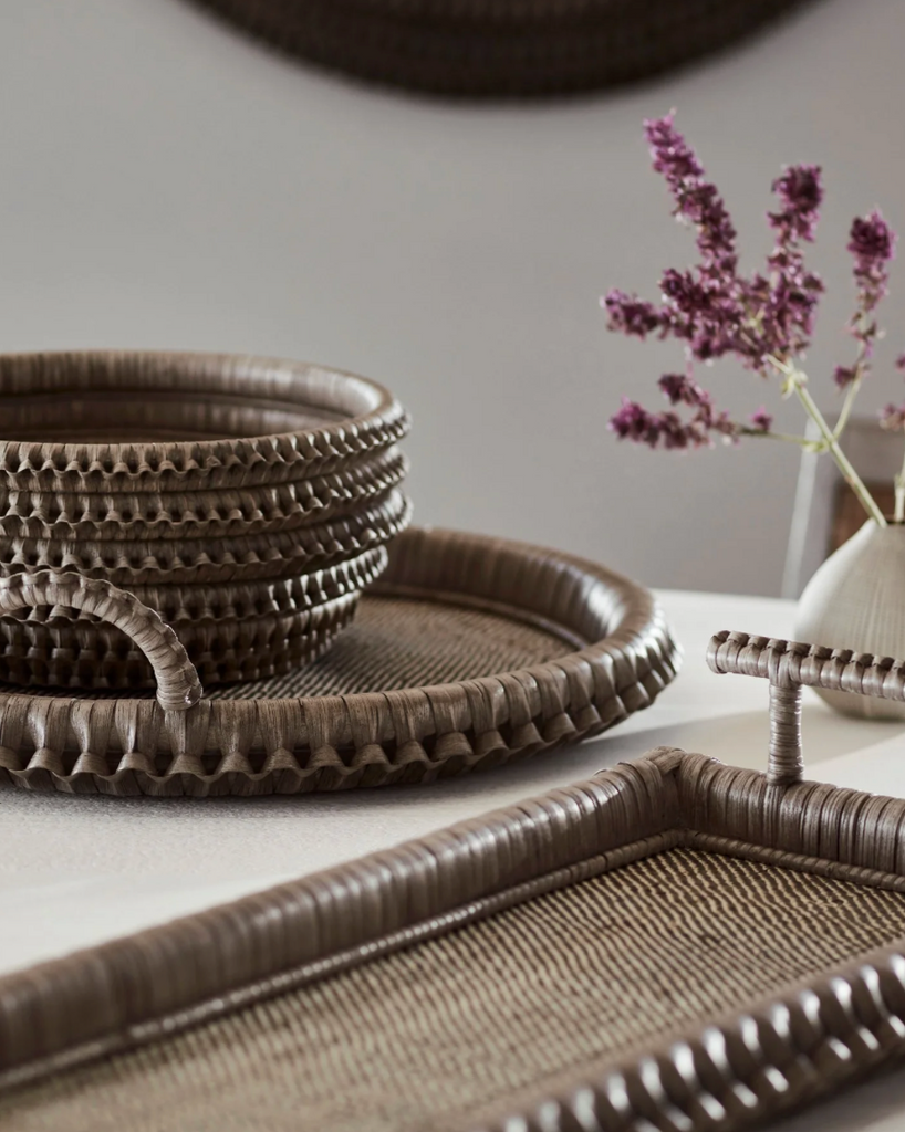Pole rattan tray with hand-woven braided rattan peel accented with brown washed abaca matting on inside bottom and hand-wrapped handles.