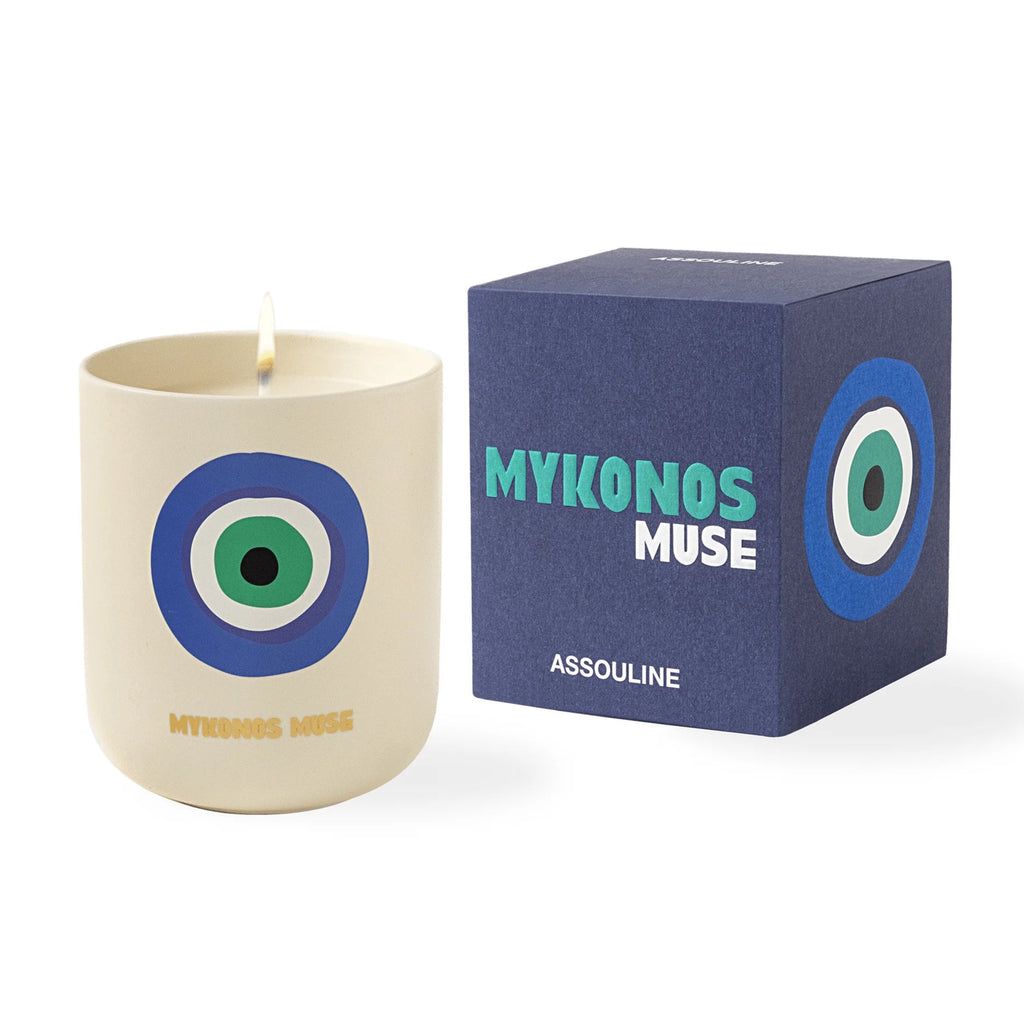 AssoulineJourney to Mykonos with the Mykonos Muse Travel from Home Candle. A magically seductive fragrance of cyclamen, - sweet, spicy - herbaceous scents, are as immersive as the Aegean Sea. Familiar notes of almond, green fig and natural aromas of tonka bean conjure a striking vista of scent transporting you to the white-and-blue island in the blink of an eye. Housed in a ceramic vessel, the candle features the same iconic serigraphy of the symbol seen on the coordinating Mykonos Muse book. Collect every destination from the Travel from Home Candle Collection.