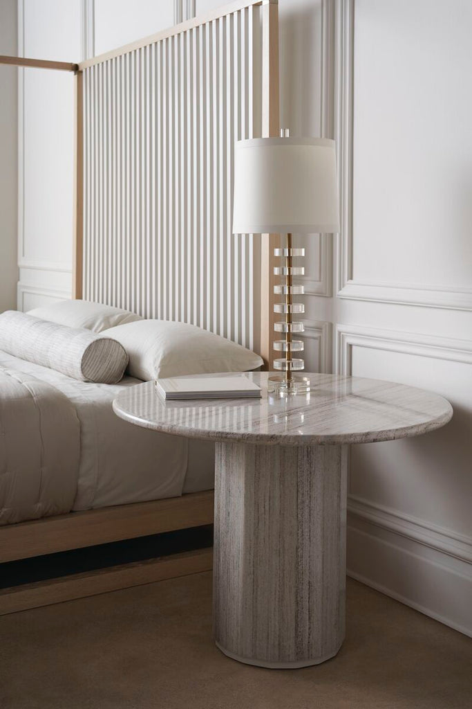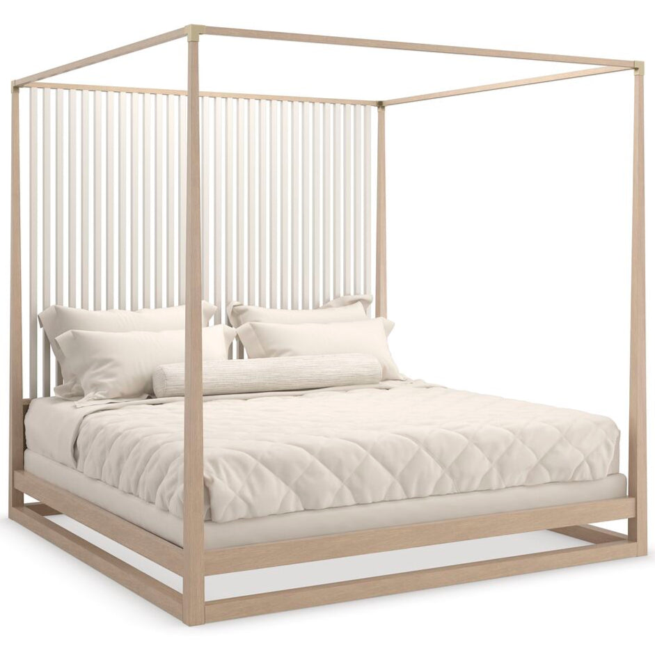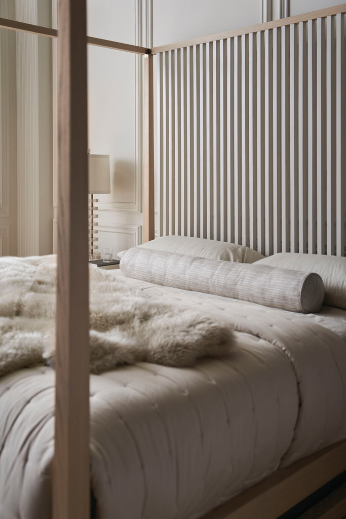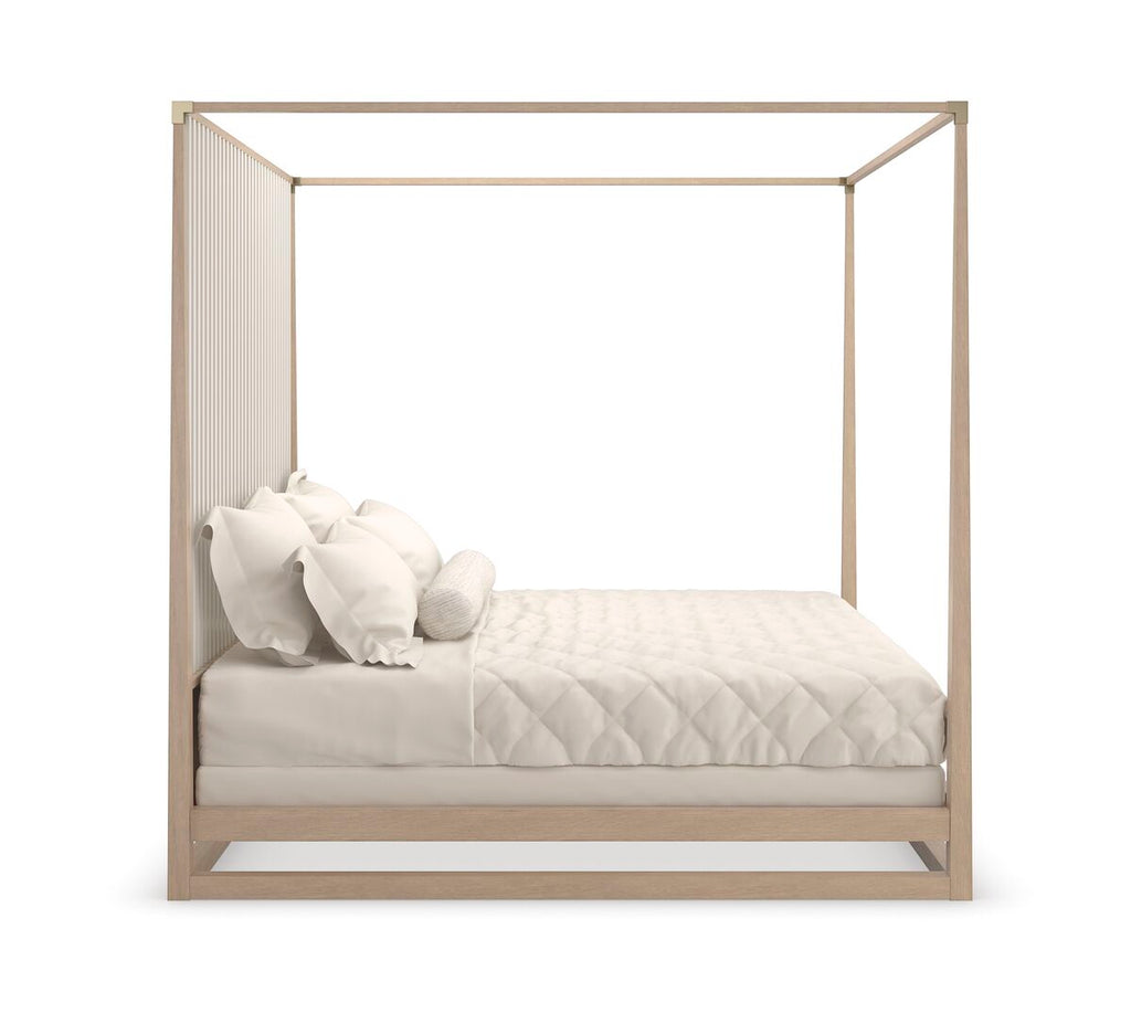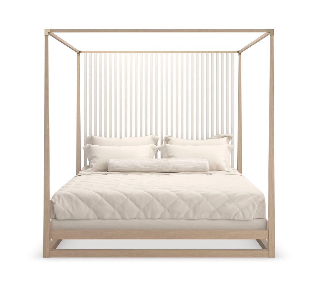 CaracoleAn updated take on the classic canopy bed, Pinstripe Light reimagines a beloved Caracole style in a fresh material mix. With a canopy and posts framed in Sundrenched quarter sawn oak, its architectural design is emphasized by cascading vertical slats in a creamy Almond Milk finish. Metal post brackets in Champagne Gold add a jewelry-like finishing touch.