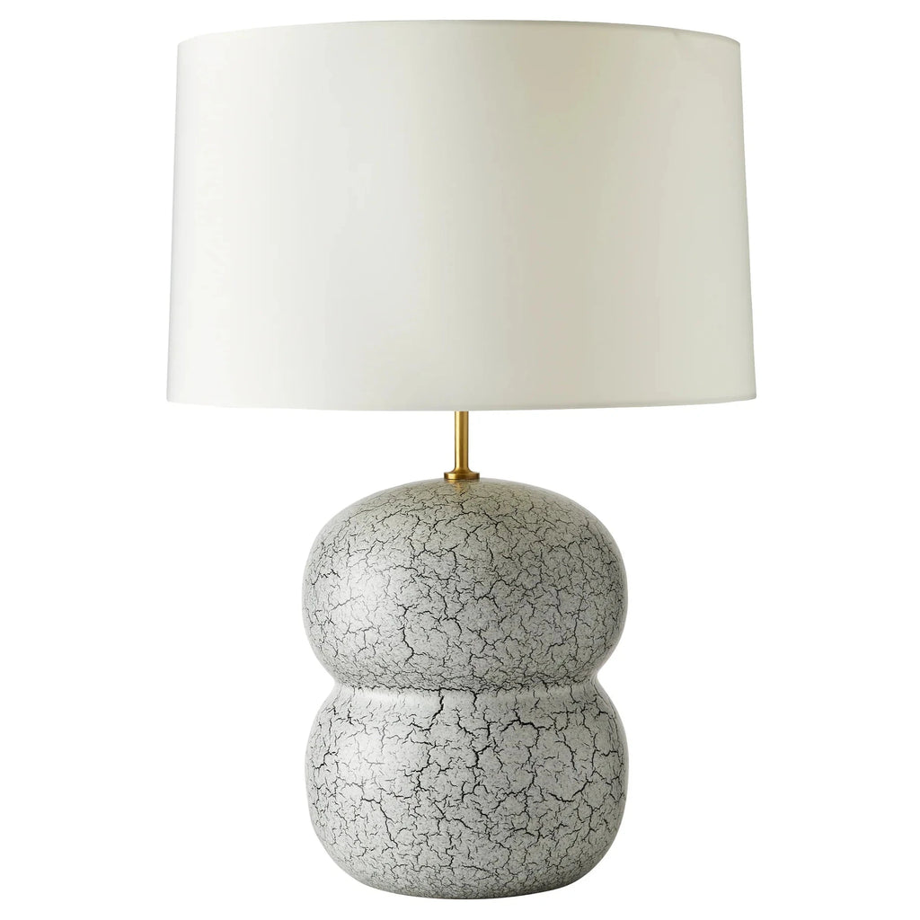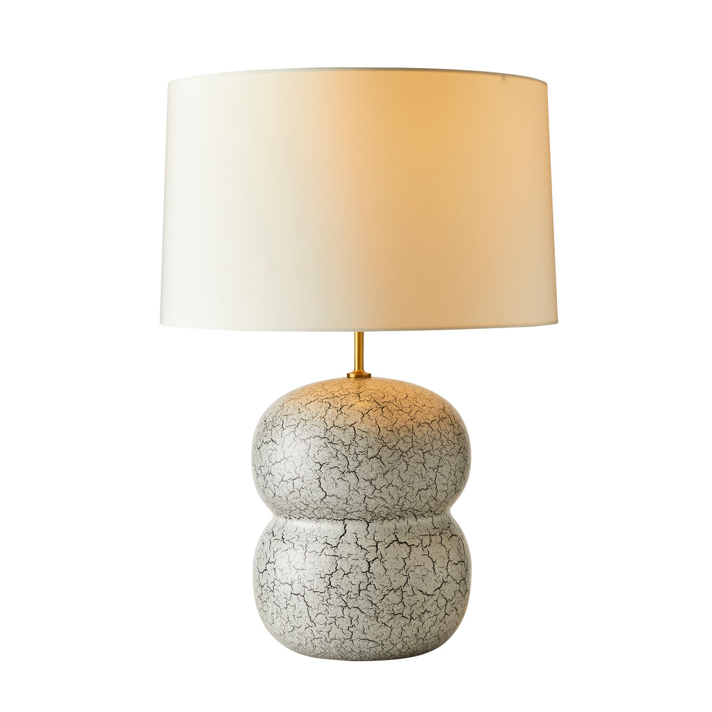 Like speckled eggs in a nest, this stacked form possesses an intriguing platinum crackled finish. Organic in appeal, the substantial ceramic Egret is accented with antique brass hardware, an ivory microfiber drum shade and a matching ceramic finial. Clear silver cord.