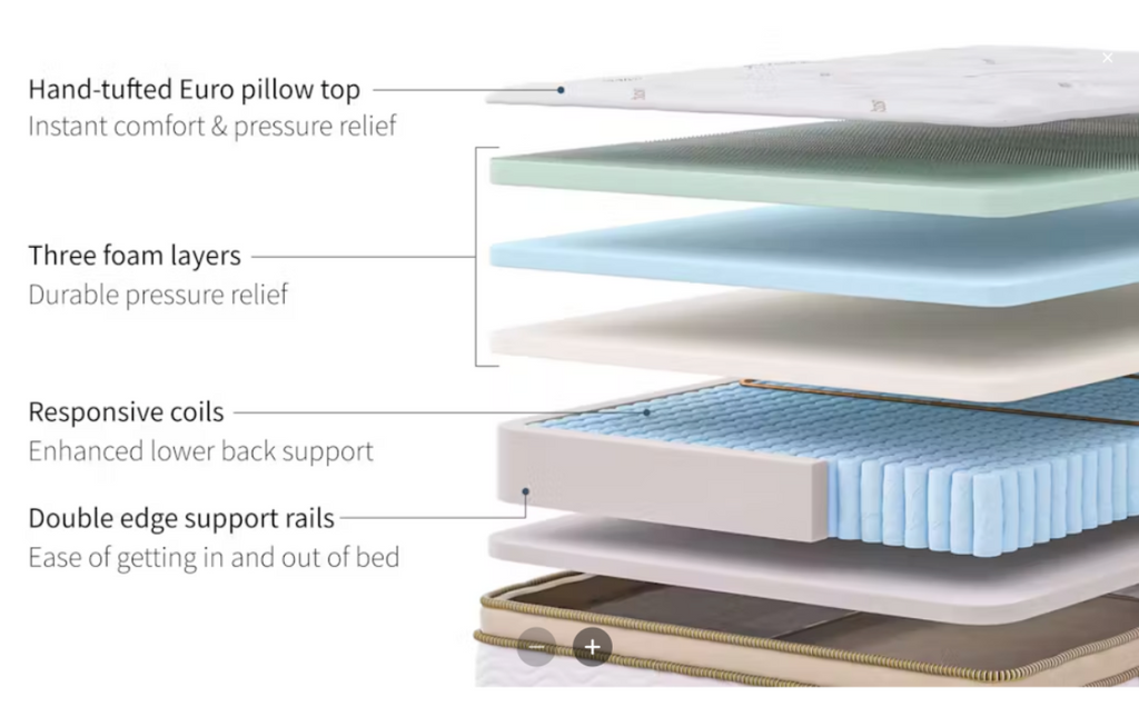 - 3" Euro pillow top with a hand-tufted finish offers plush, cushioned comfort for every body type