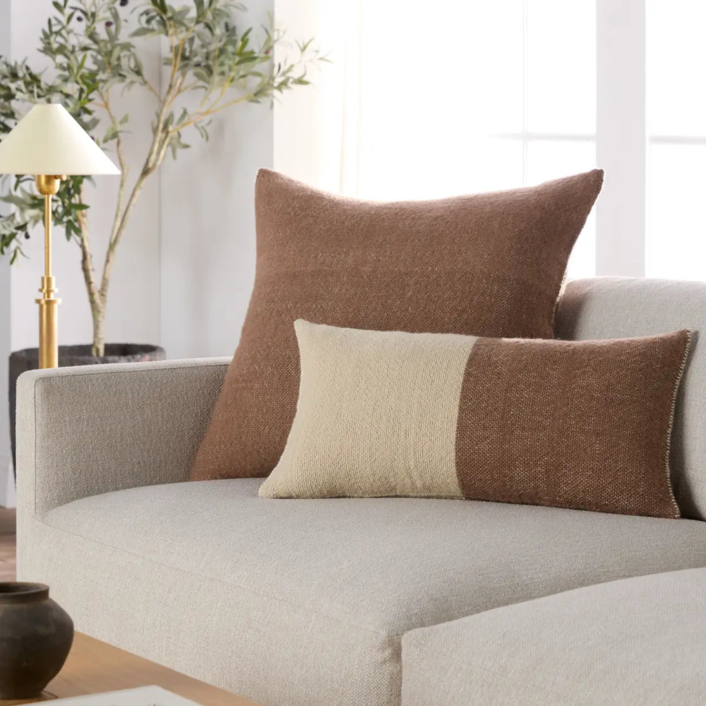 The Margosa collection, offering stonewashed and embroidered handcrafted throws, blankets, and bedding expertly crafted of soft cotton and hand-spun wool. Grounded in ancient textile traditions, this collection brings natural designs and textures through indigenous techniques, nature-inspired colors, and raw fibers. The 100% wool Abdul pillow features a duo-tone brown and cream pattern.