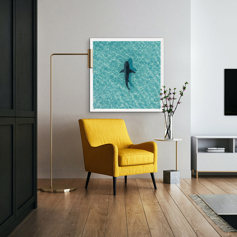 A beautiful lemon shark drifts its way through the clear shallow waters of the Bahamas. The simple way in which the single shark is center in the frame, surrounded by the cool blue ocean, is wonderfully captivating.