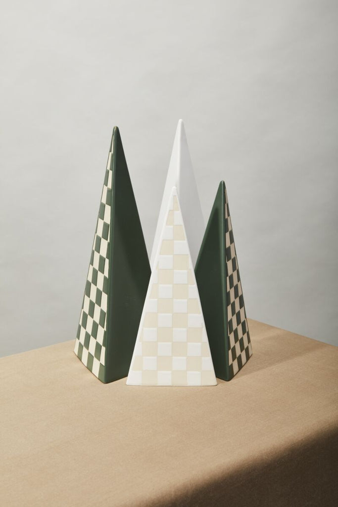 Give your holiday decor a bit of trendy flair with the dimensional natural clay small triangular tree figurine with a deep green checkerboard pattern on 1 side & 2 solid green sides. It perfectly pairs with modern, handmade & vintage decor.
