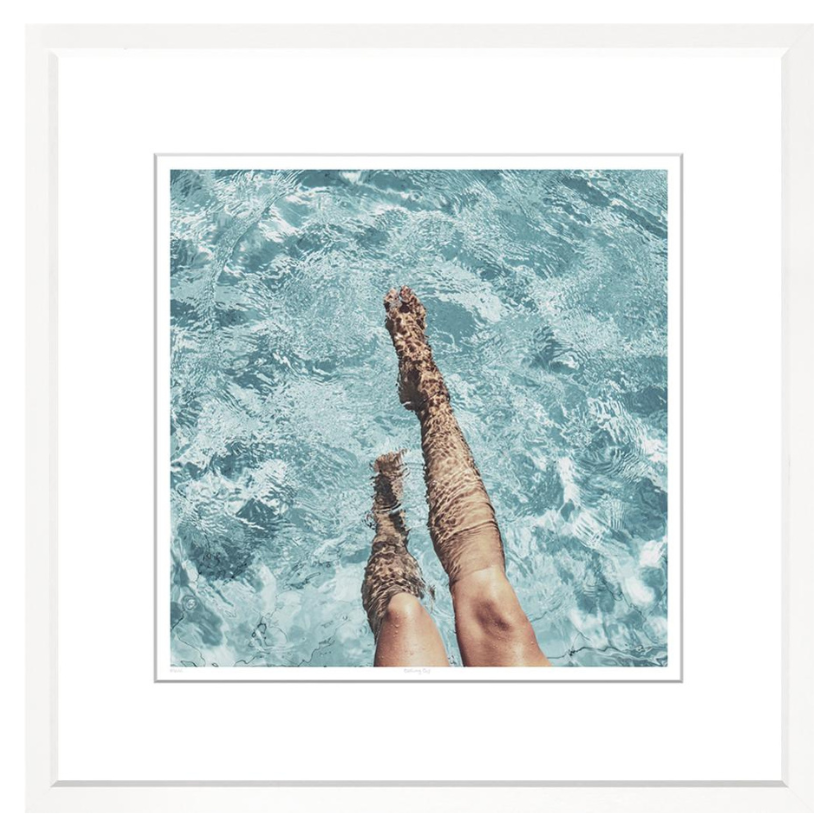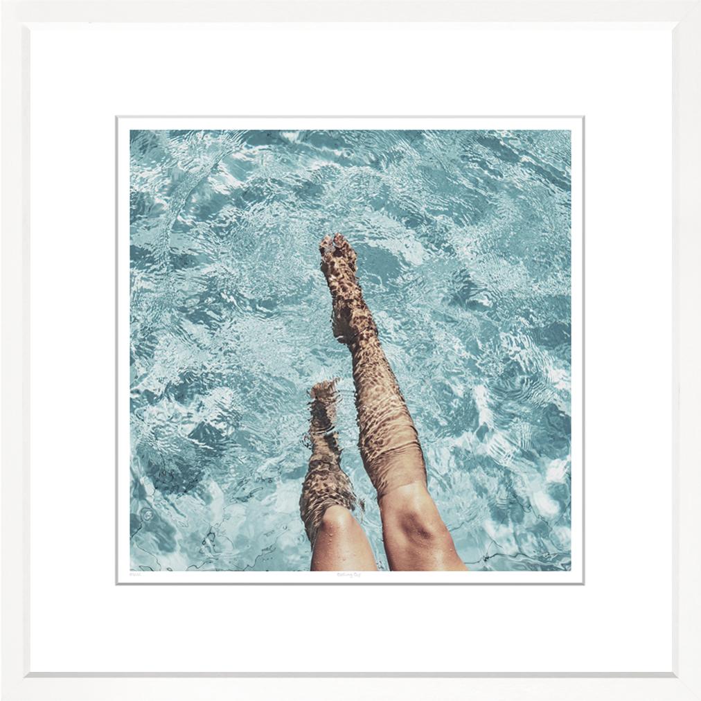 A woman cools off in the swimming pool on a hot day. The model's legs are dappled with the glassy, water texture of the pool, a satisfying view with what feels like a tangible moment. The pool seems fresh, cool, and inviting.
