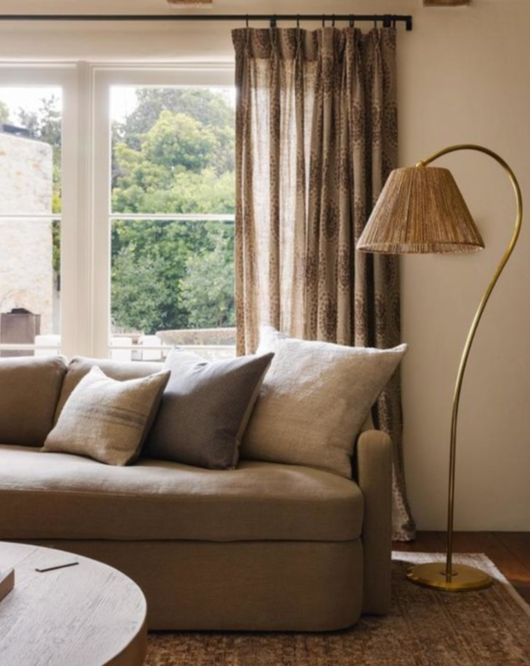 Sophistication and simplicity define the Dume Large Arched Floor Lamp by Amber Lewis. The statement floor lamp features curved lines in varying metallic finishes that contrast organic materials like linen and natural abaca to elevate any room, including home offices, guest rooms and living rooms.