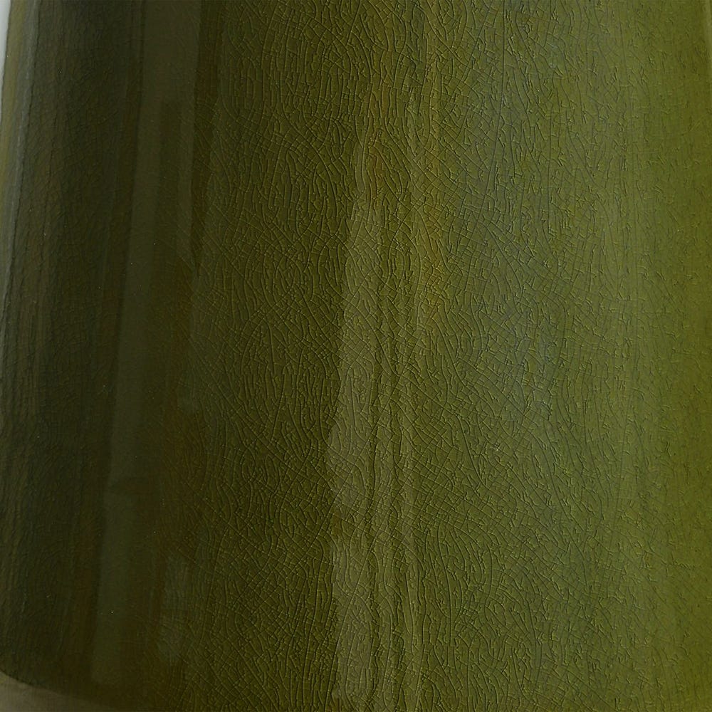 This timeless ceramic lamp is finished in a crackled moss green glaze that's accented with antiqued brass plated details. The round hardback drum shade is an oatmeal linen fabric with light slubbing.