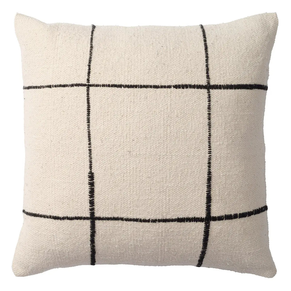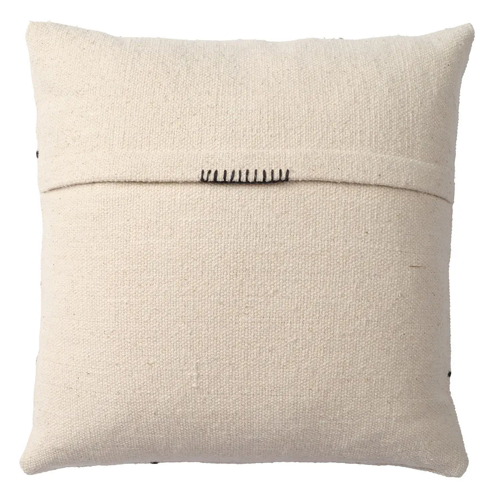 The Margosa collection, offering stonewashed and embroidered handcrafted throws, blankets, and bedding expertly crafted of soft cotton and hand-spun wool. Grounded in ancient textile traditions, this collection brings natural designs and textures through indigenous techniques, nature-inspired colors, and raw fibers. The Najma pillow is crafted from 100% cotton with a solid white design, accented by a bold black stripe for a striking focal point. Its square shape and subtle texture make it a versatile accent.