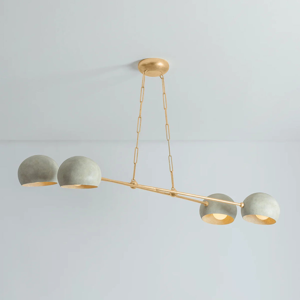 Inspired by a mobile, this retro chandelier silhouette has been softened by earthy metal finishes and rounded forms. 4 dome shades are finished in Limewash Plaster, while the slender framework is finished in Vintage Gold Leaf. The entire fixture is supported by jewelry-like decorative chains hanging from a classic canopy.