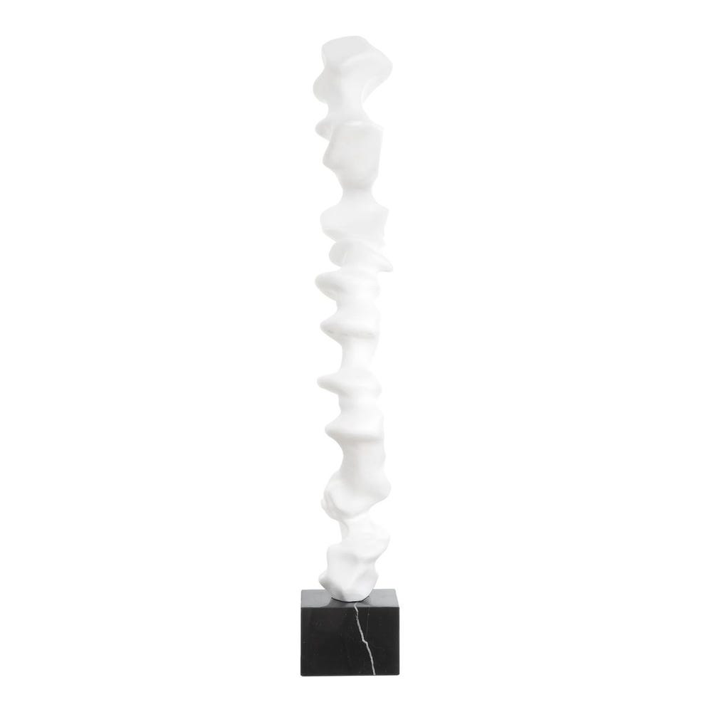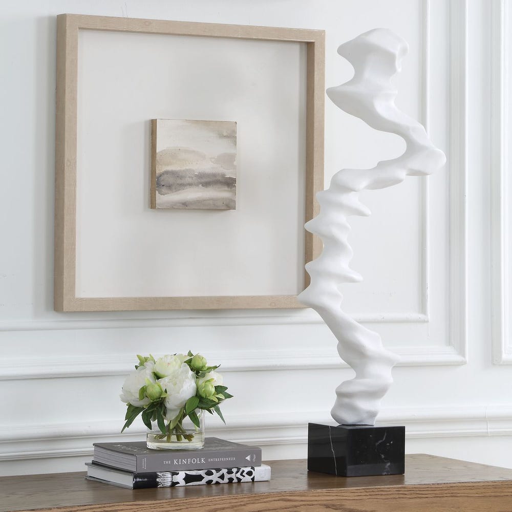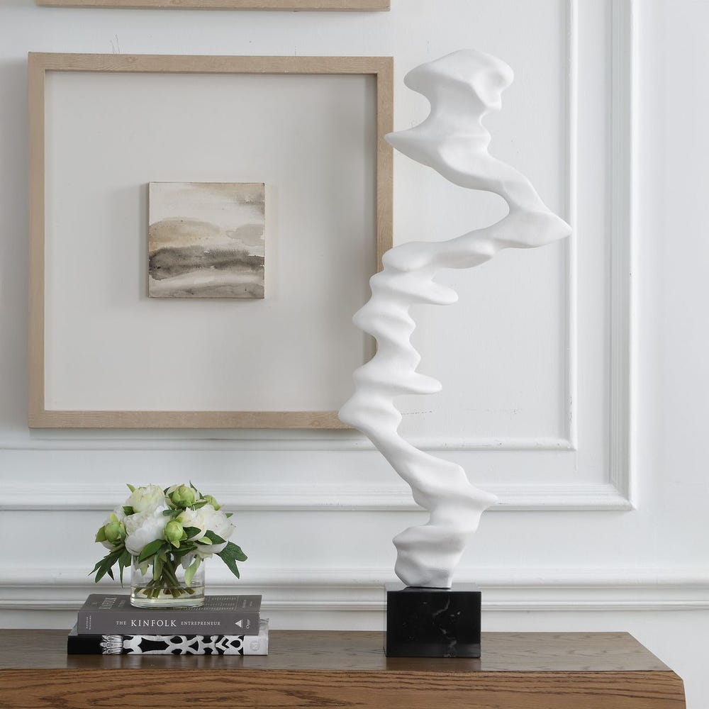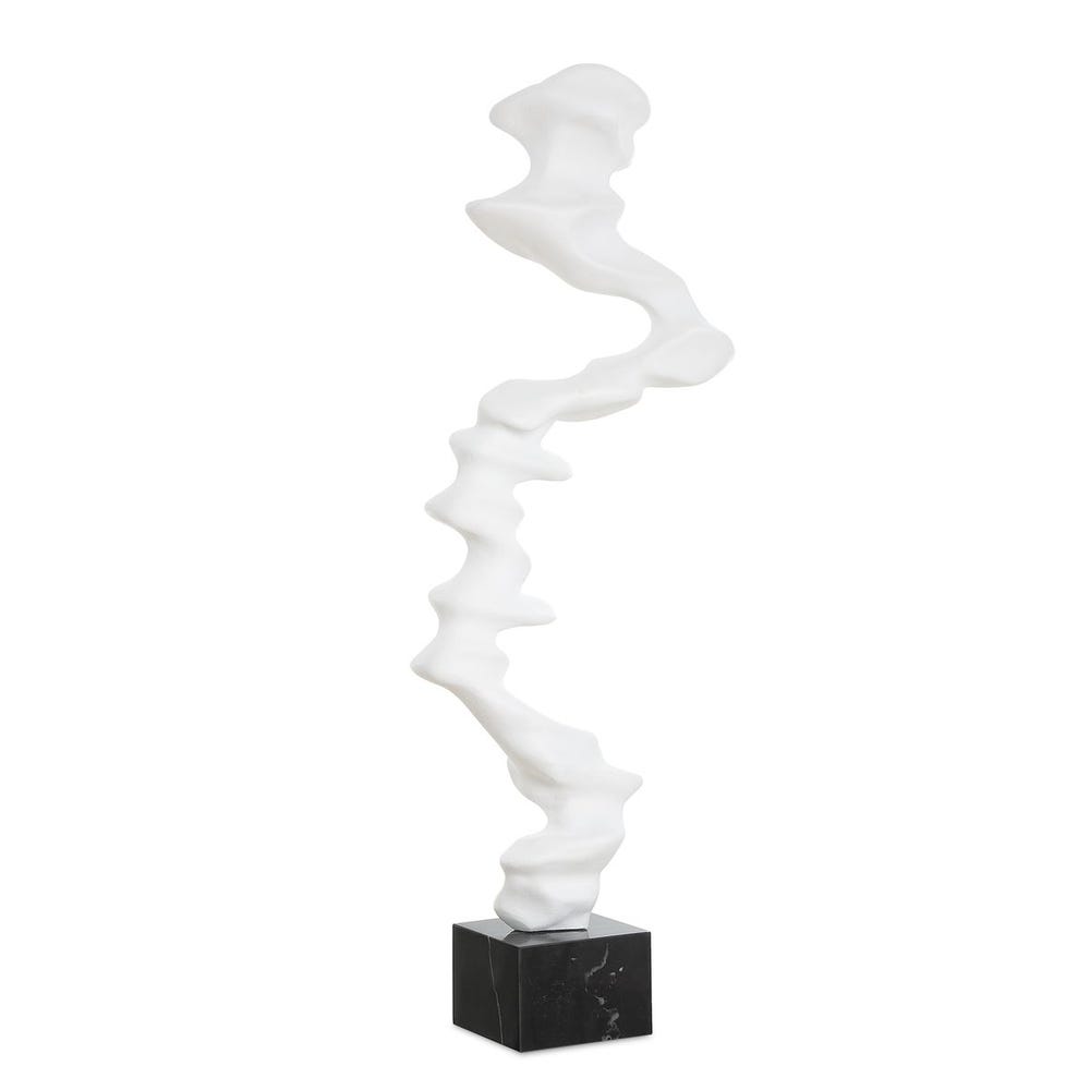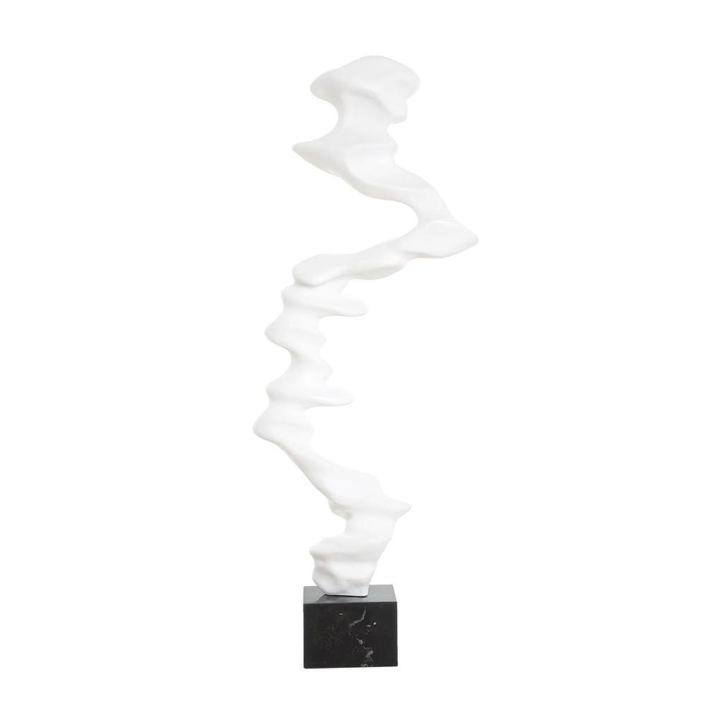 A striking interplay of movement and form, this abstract sculpture rises in a fluid, wave-like silhouette crafted in matte white resin. Anchored on a polished black marble base, it brings modern artistry and graceful motion to any space. Safe for outdoor use.