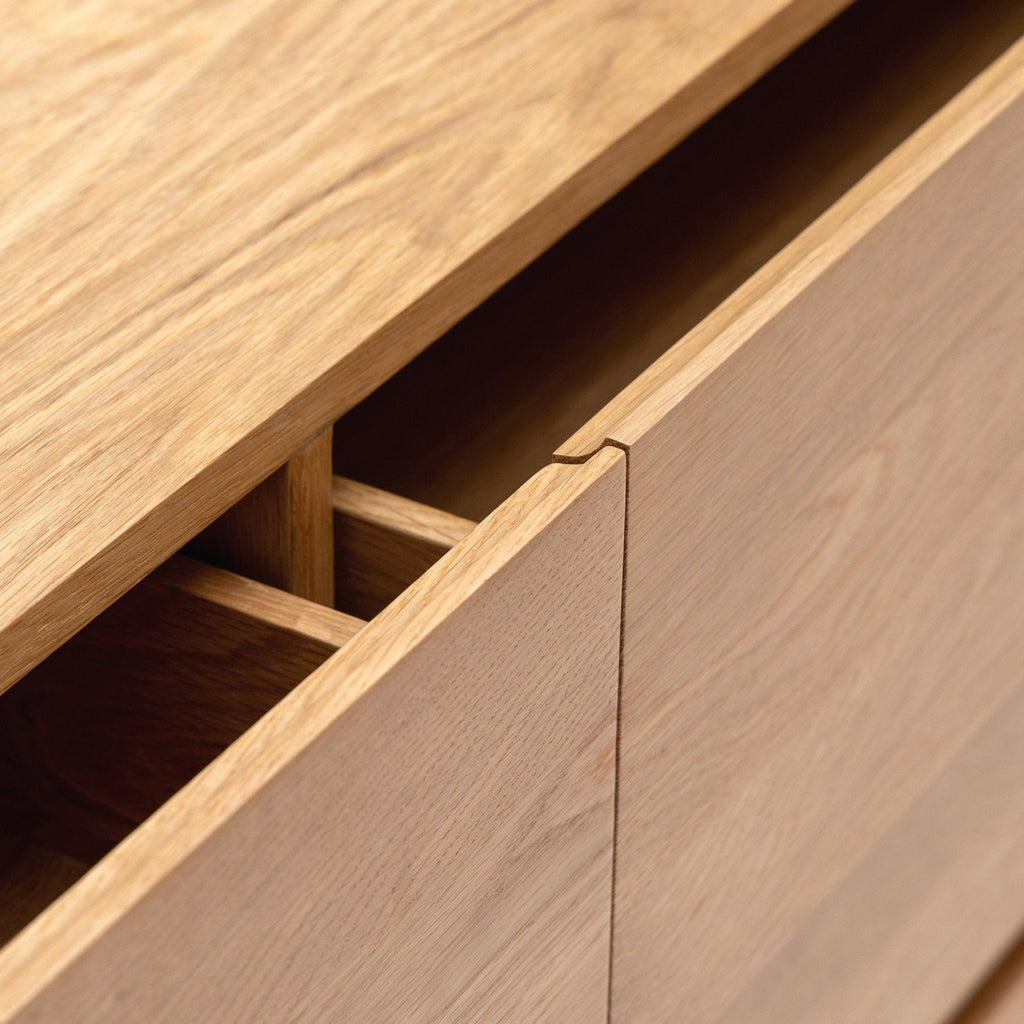 Nell Chest of drawers is a composition of harmonious details that create a contemporary bedroom statement piece. Each element invites attention and tactile interaction. The scalloped top shelf provides a safe top surface, while the front edge opens the doors revealing ample storage and internal drawers. Nell celebrates the beauty of timber joinery and timeless architectural forms.