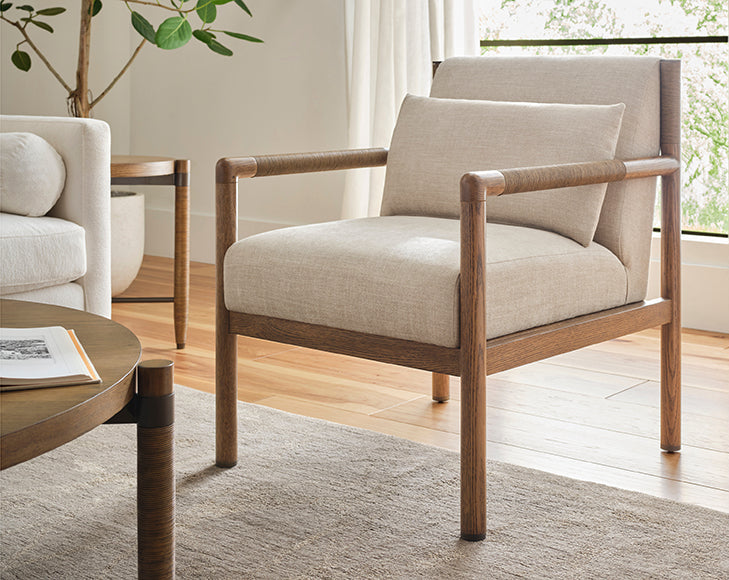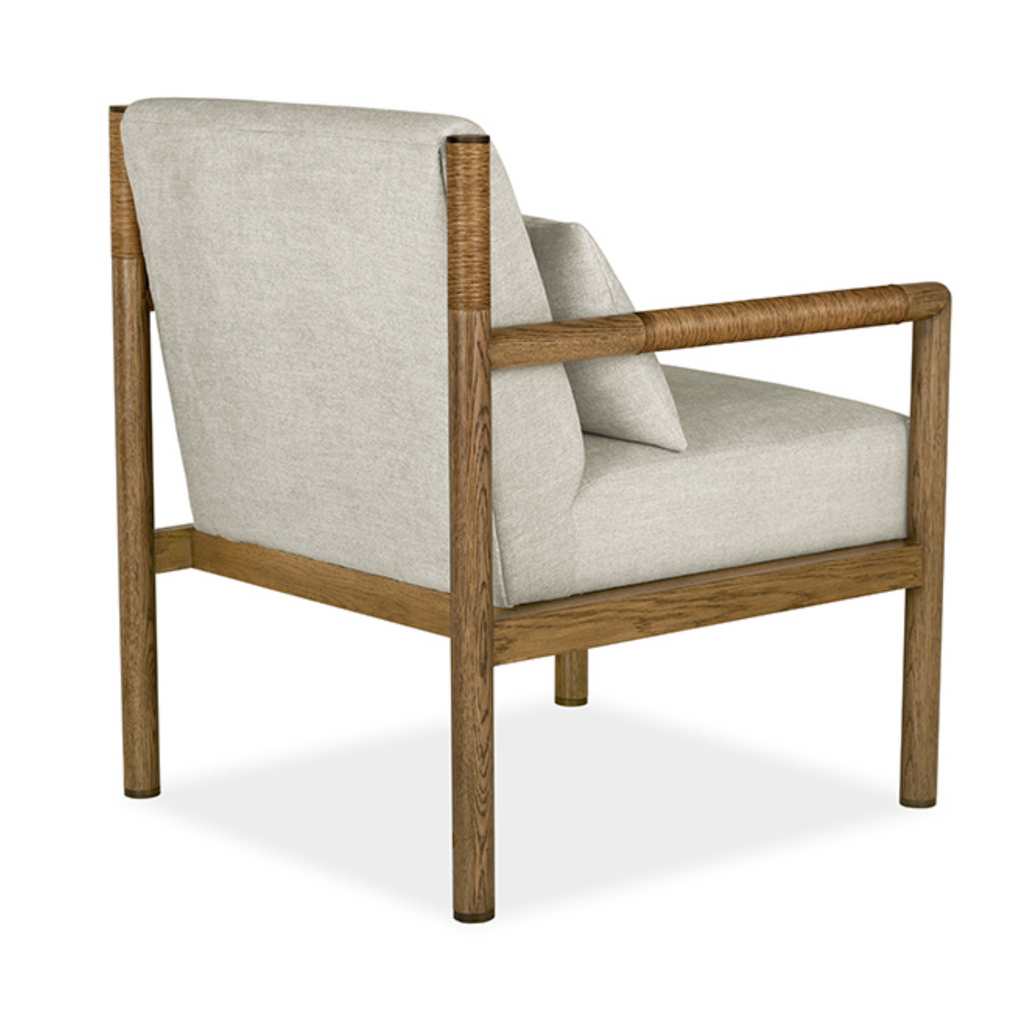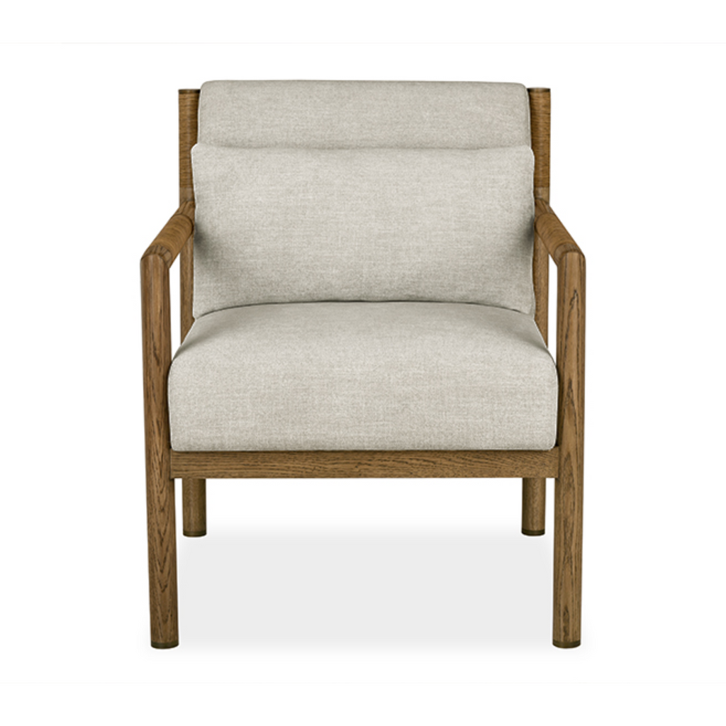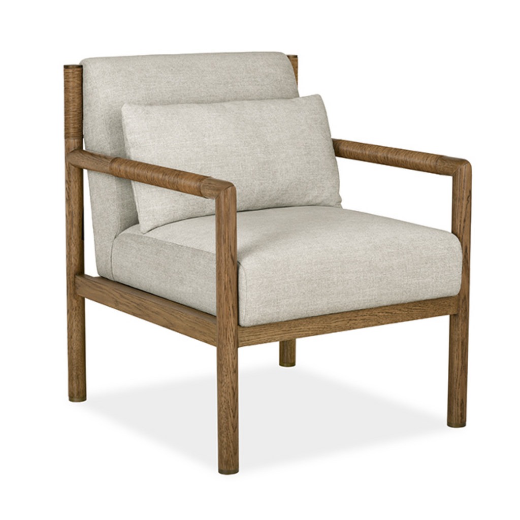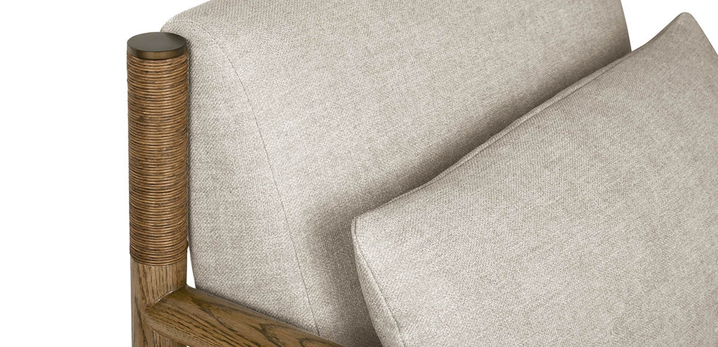 Make a stylish statement with the Sydney Occasional Chair, where comfort meets refined elegance. Upholstered in a durable Crypton performance fabric, this chair features a plush feather-back pillow and clean lines that exude cozy sophistication. Organic bronze accents and rattan details add warmth, while the solid oak frame boasts a richly grained finish.