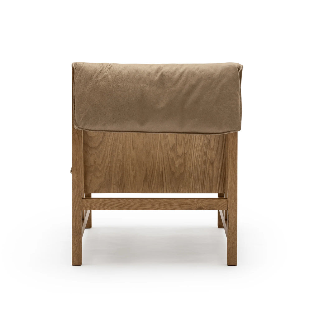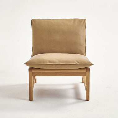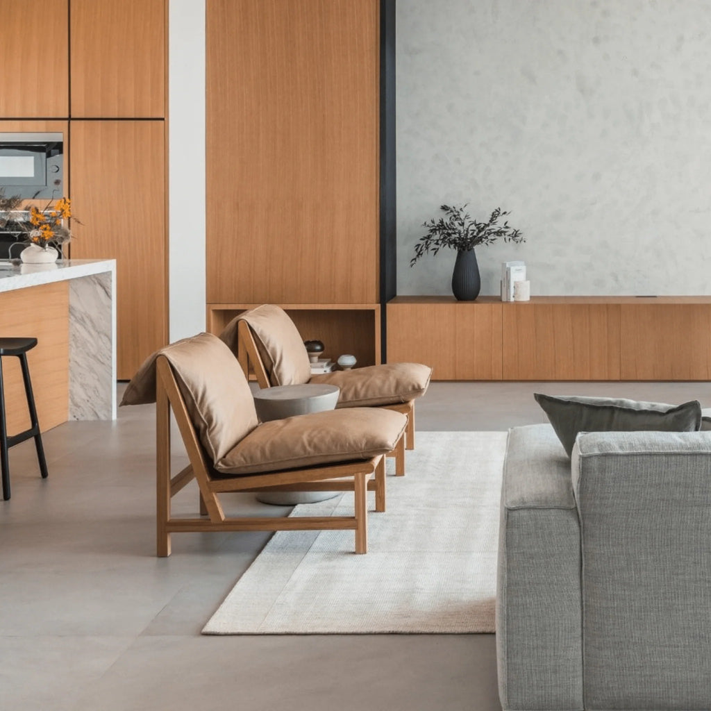 The stark architectural form of the wooden frame contrasts with the slack futon form which sits loosely on top of woven seat-belt webbing supports. The overhanging back pillow flips forward to provide extra support.