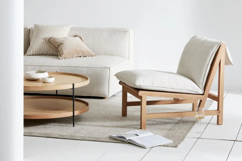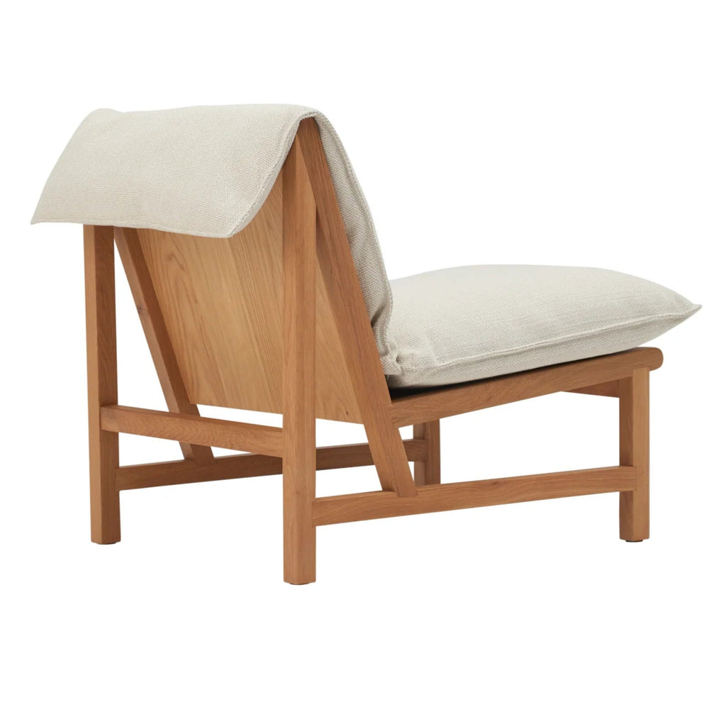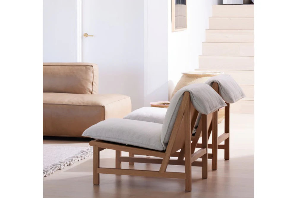 The stark architectural form of the wooden frame contrasts with the slack futon form which sits loosely on top of woven seat-belt webbing supports. The overhanging back pillow flips forward to provide extra support.