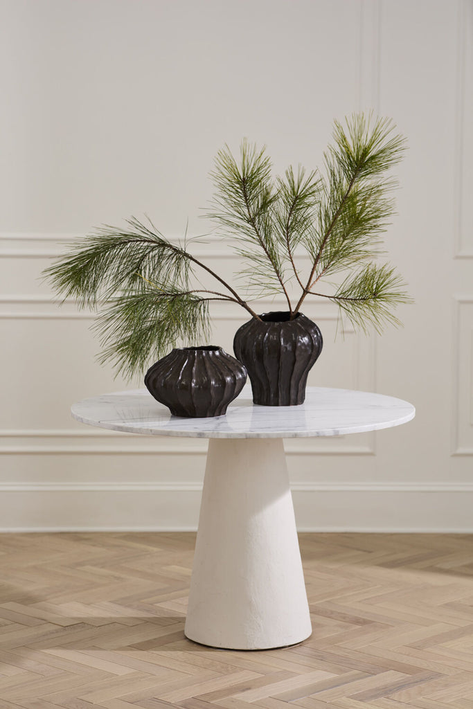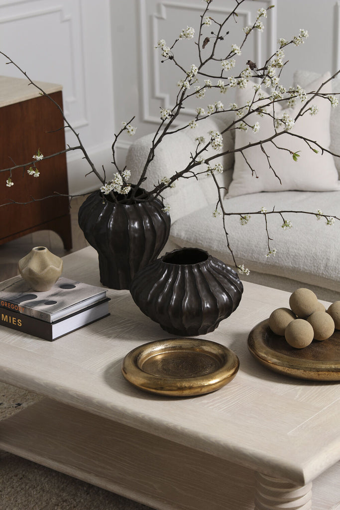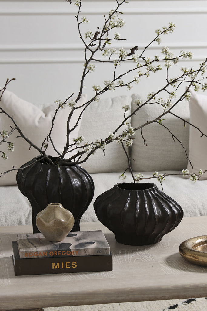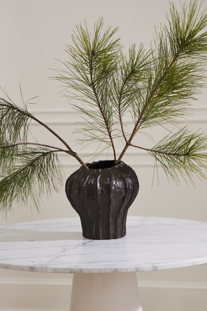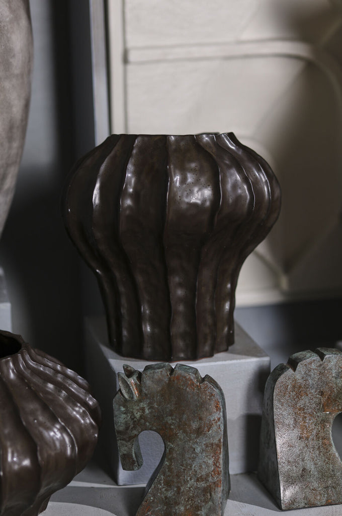 With an artful organic shape & dimensional ripples, the large-scale stoneware Attica Vase brings sculptural interest to home decor on a console, shelf, or pedestal. Featuring a beautiful dark brown smooth semi-gloss glaze with subtle glossy flecks, this vessel makes a statement with florals or displayed on its own.