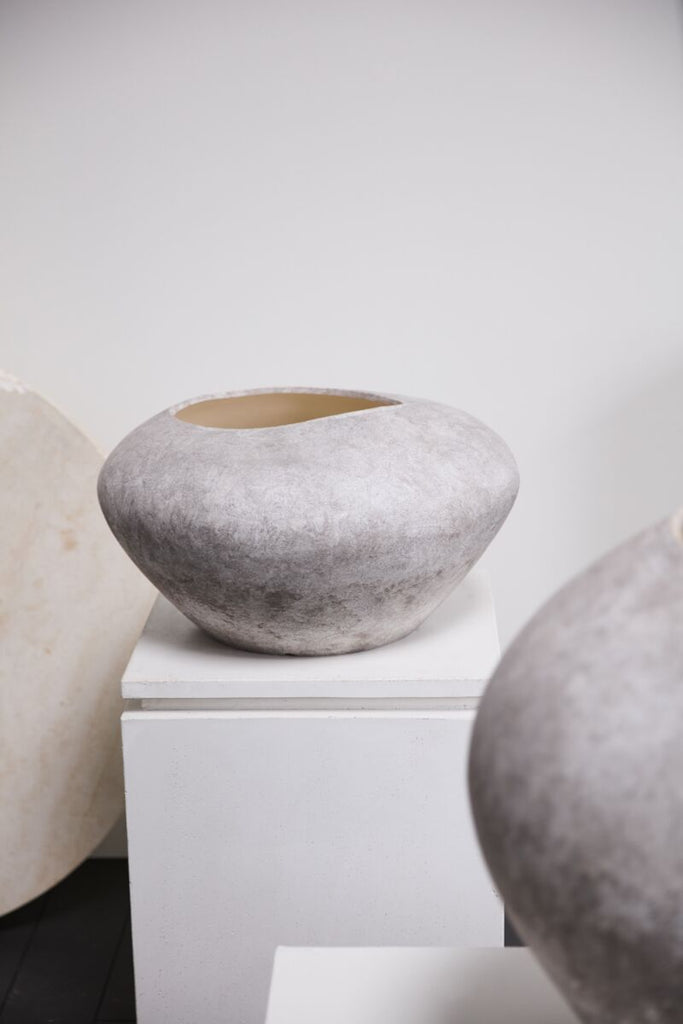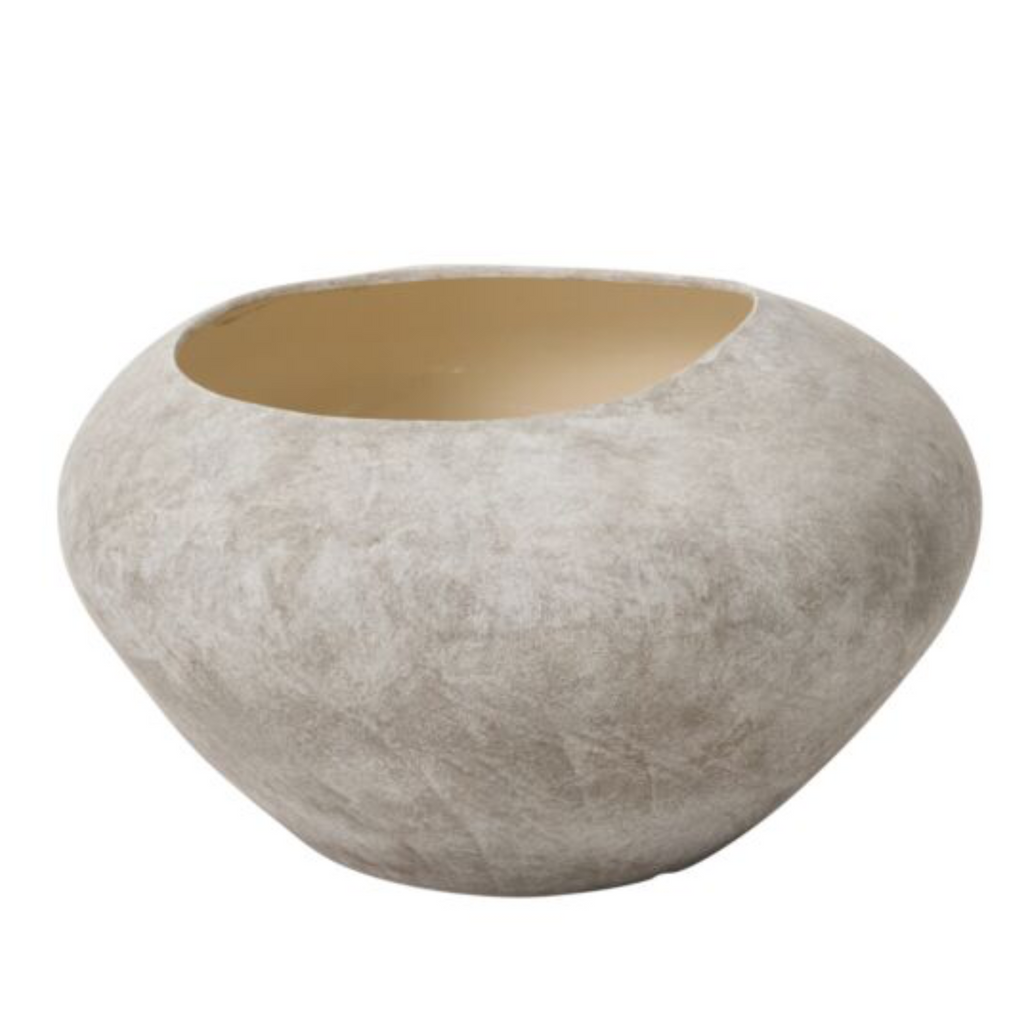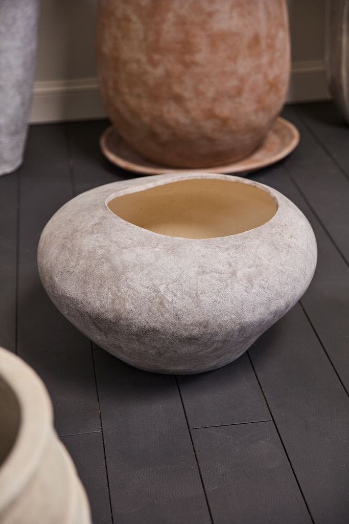 Create a powerful focal point in the home with the old-world look & organic intrigue of the ceramic Angelou Pot. This large-scale vessel features an off-center & irregular-shaped opening, as well as a matte finish with shades of grey & white that resemble stone. Fill this planter with a tree or statement branches for a floor-based decorative home decor piece.