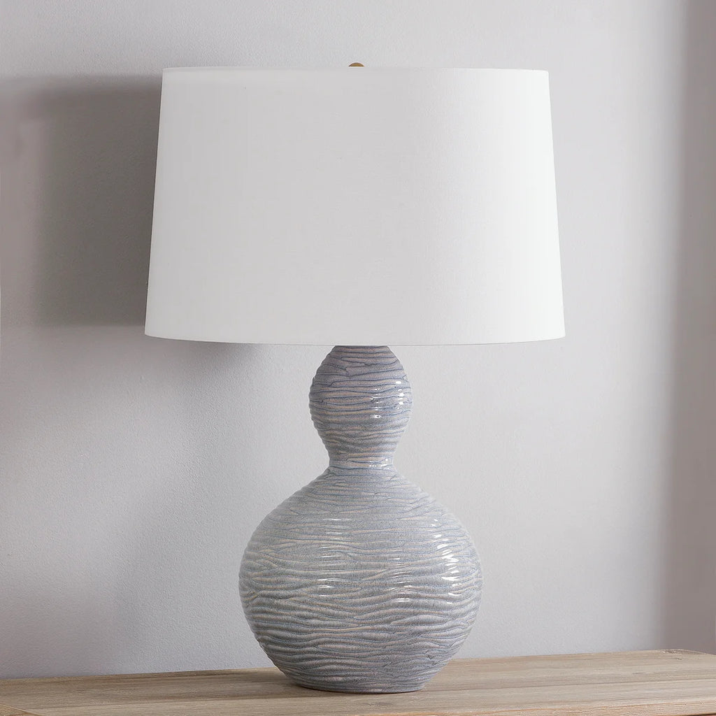 Cairns' organic bulbous shape, textured ceramic base, and white linen shade makes this table lamp a natural beauty. The Ceramic Coastal Blue finish is a reactive glaze, creating color and movement as light spills down the base.