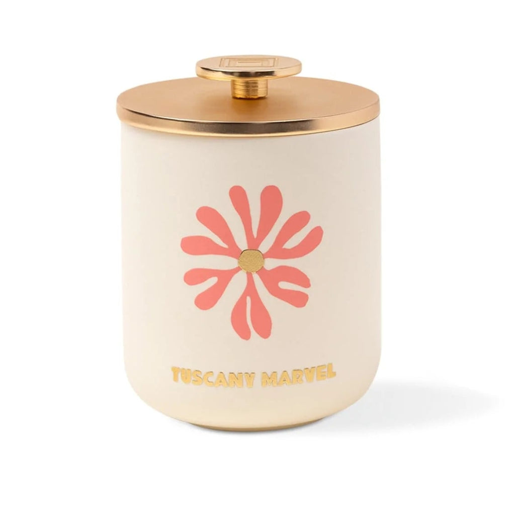 AssoulineJourney to Tuscany with the Tuscany Marvel Travel from Home Candle. Tuscany’s rolling hills unfold with crispy and invigorating notes of basil and black pepper followed by an evocative heart of tomato leaves, bamboo and cassis that undeniably captivates the spirit of a Tuscan summer. With a crisp amber dry down, we fall into the warmth of a setting that never ceases to enchant. Housed in a ceramic vessel, the candle features the same iconic serigraphy of symbols seen on the coordinating Tuscany Marvel book.
