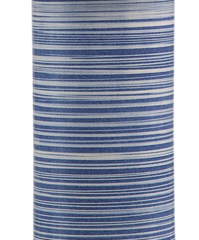 Showcasing trendy white and indigo hues, this ceramic table lamp has a striped glaze with polished nickel accents. The round hardback drum shade is a white linen fabric.