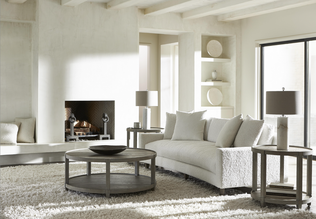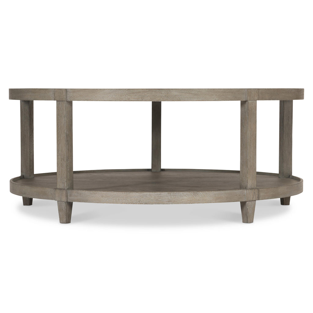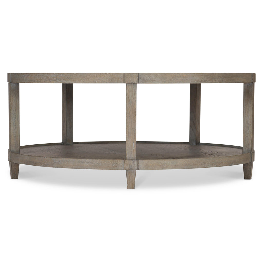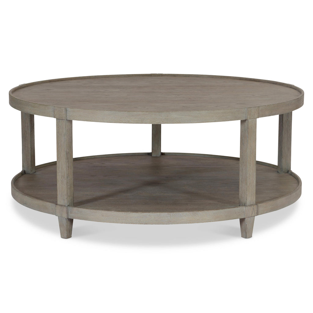 Two sweeping circles in the Albion cocktail table are joined with tapered legs to create a casually elegant cocktail table. The texture of cerused oak and a layered Pewter finish create the look of history and weathered wood. A band of wood around the top and shelf offer a traditional gallery design in a simpler form.