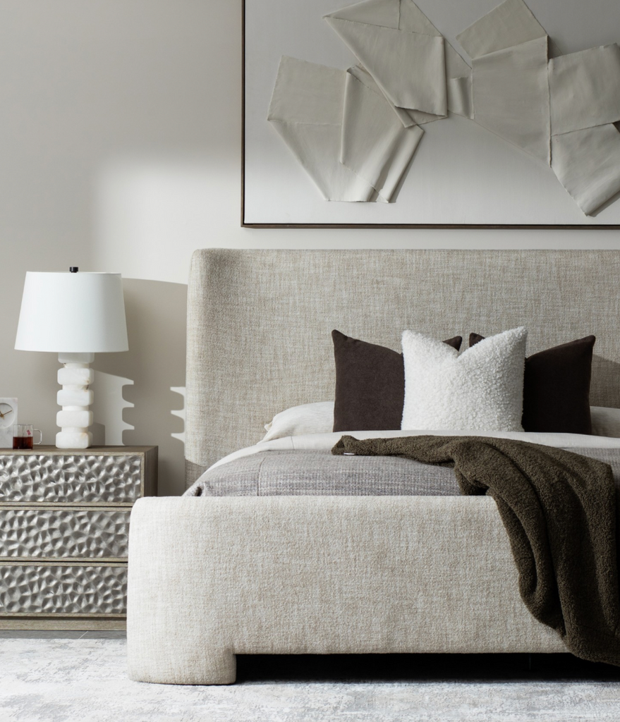 Bold shapes and soft curves craft a balanced modern design on the Pemba bed. A tall headboard gently curves into a sheltering shape thats mirrored by the footboards design. An open base defines the feet on each end, while the comfort story continues with upholstered side rails.