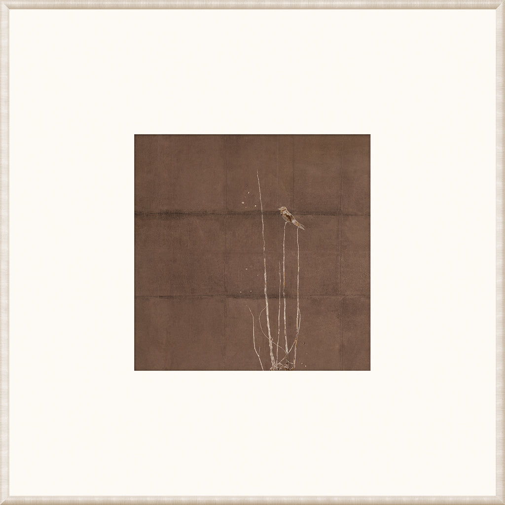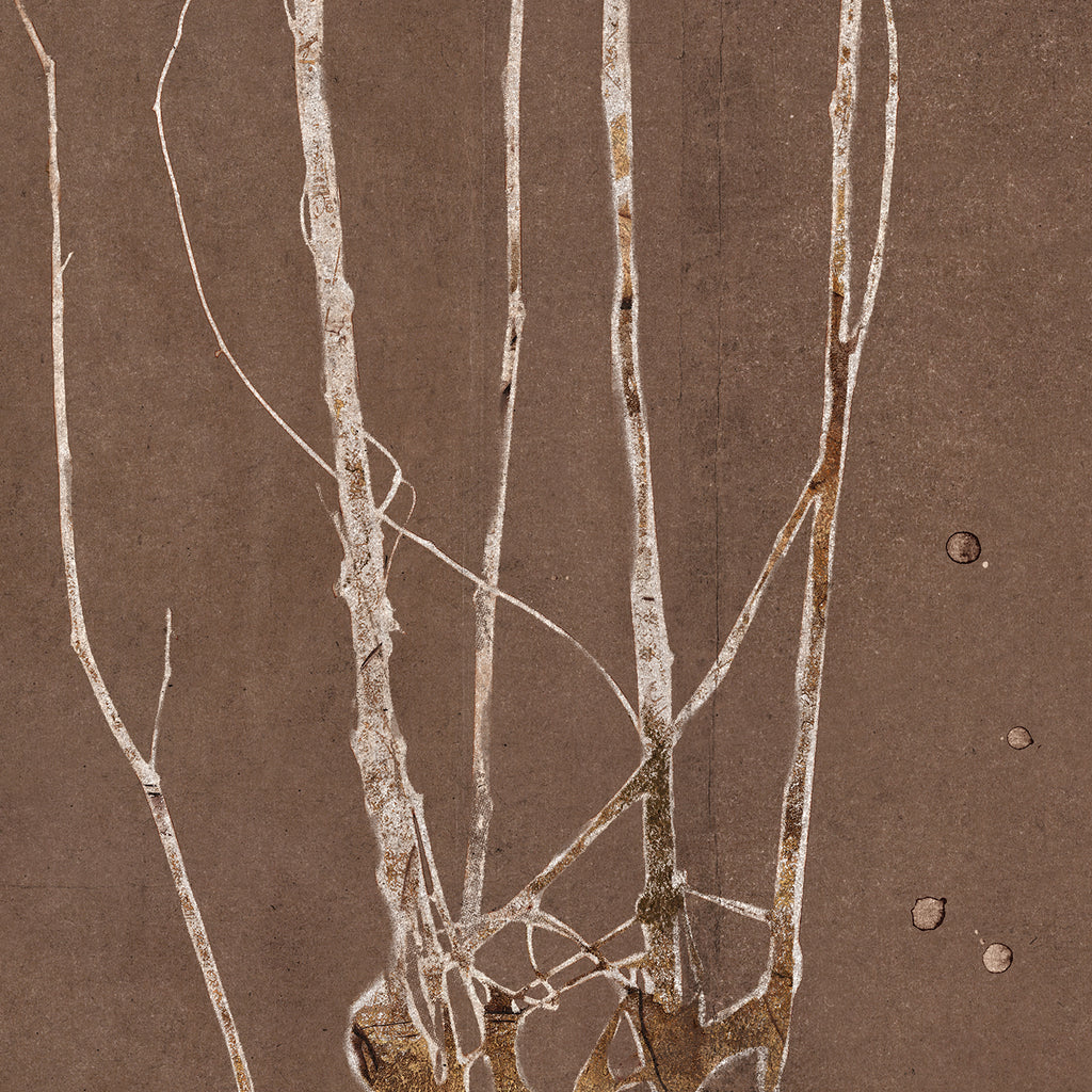 The delicate lines and use of negative space in this print highlight the ephemeral nature of the moment captured within. Thin lines of white and cream outline the shapes of birds and foliage in a variety of settings, standing out against varying shades of brown, creased paper backgrounds.