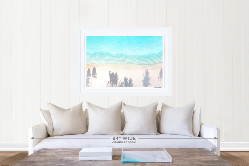 Relax by the water as the sun begins to rise over the palm trees in PALM SHADOWS, OAHU from Gray’s beloved aerial series, À la Plage.
