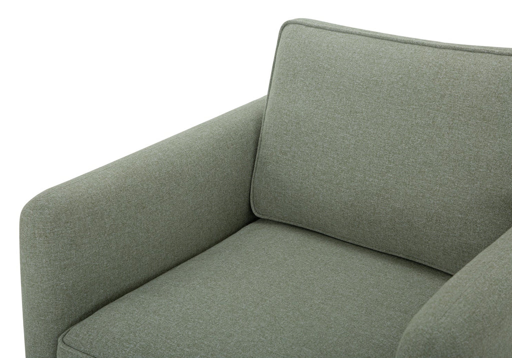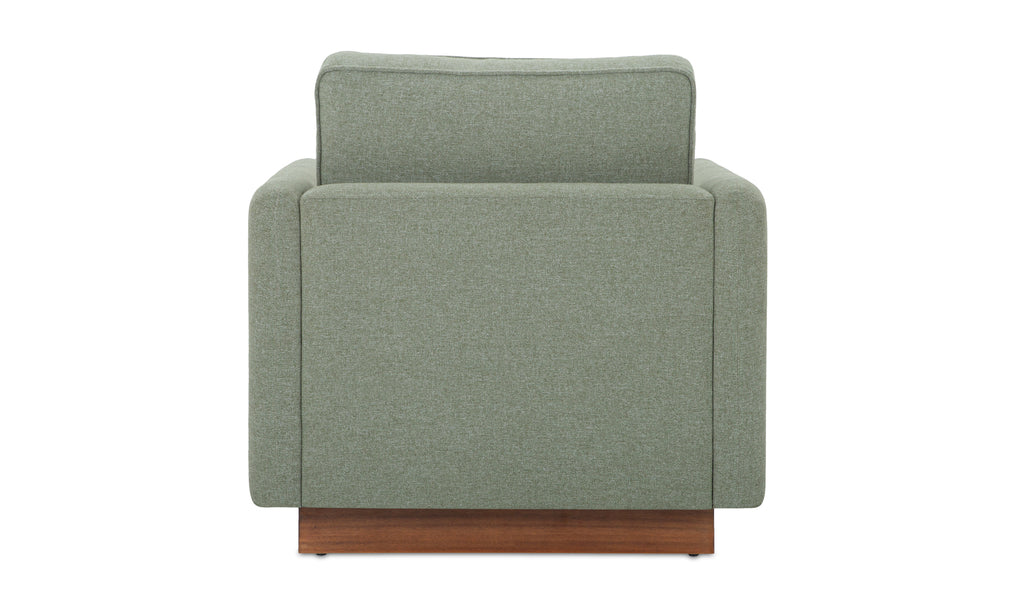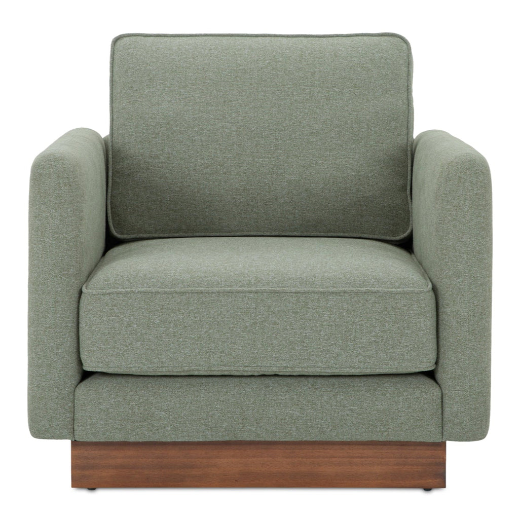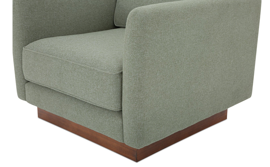 The Vernon accent chair blends mid-century design with modern functionality. It features a wooden plinth base for an elevated, lighter appearance. This chair offers unmatched comfort with removable cushions.