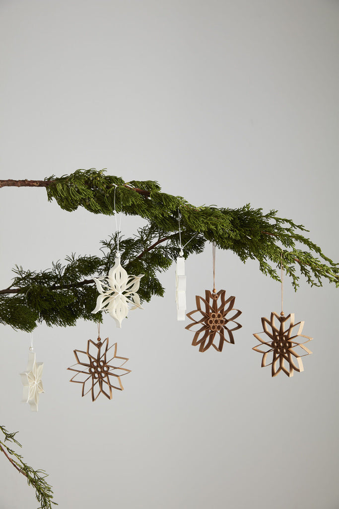 Design the feel of a handcrafted holiday home with the understated beauty of the handmade brown craft paper Yule Ornament. Strung with a delicate pearl on top of each, these lightweight, dimensional snowflakes add a festive touch to a Christmas tree.