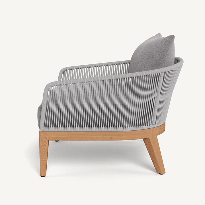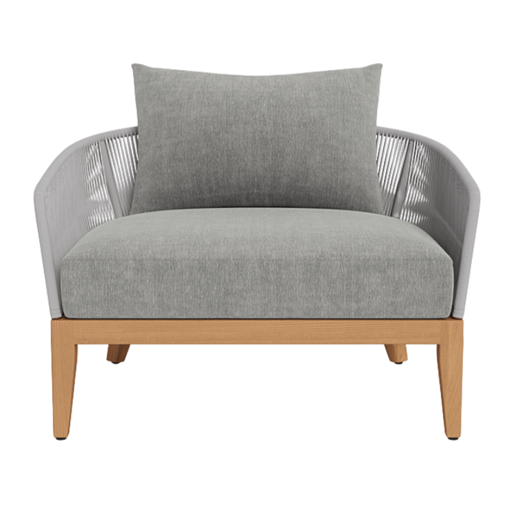 Harbour OutdoorA nod to the Australian surf town of Avalon Beach, the Avalon collection pairs clean lines with practical design for surfside relaxation anywhere. The Avalon Lounge Chair is contemporary relaxation — featuring a solid teak frame with tapered legs, signature sculptural contours and double–layered woven Olefin rope accents. Enjoy a plush all–weather cushion with a knife–edge back cushion for total comfort. Deep enough to accomodate additional accent pillows, this effortless piece is made to be incredibly versatile, elevating any space.