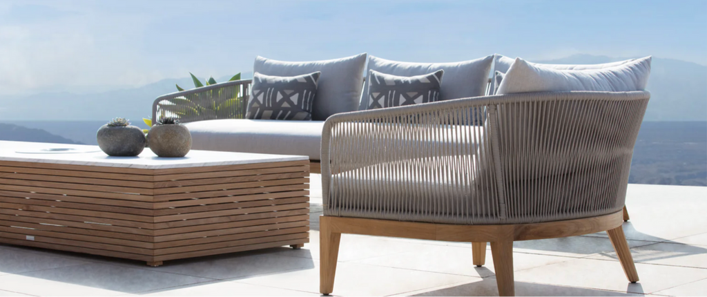 - Back and arms handwrapped with all–weather Olefin rope, a defining feature of the collection that adds comfort and visual interest