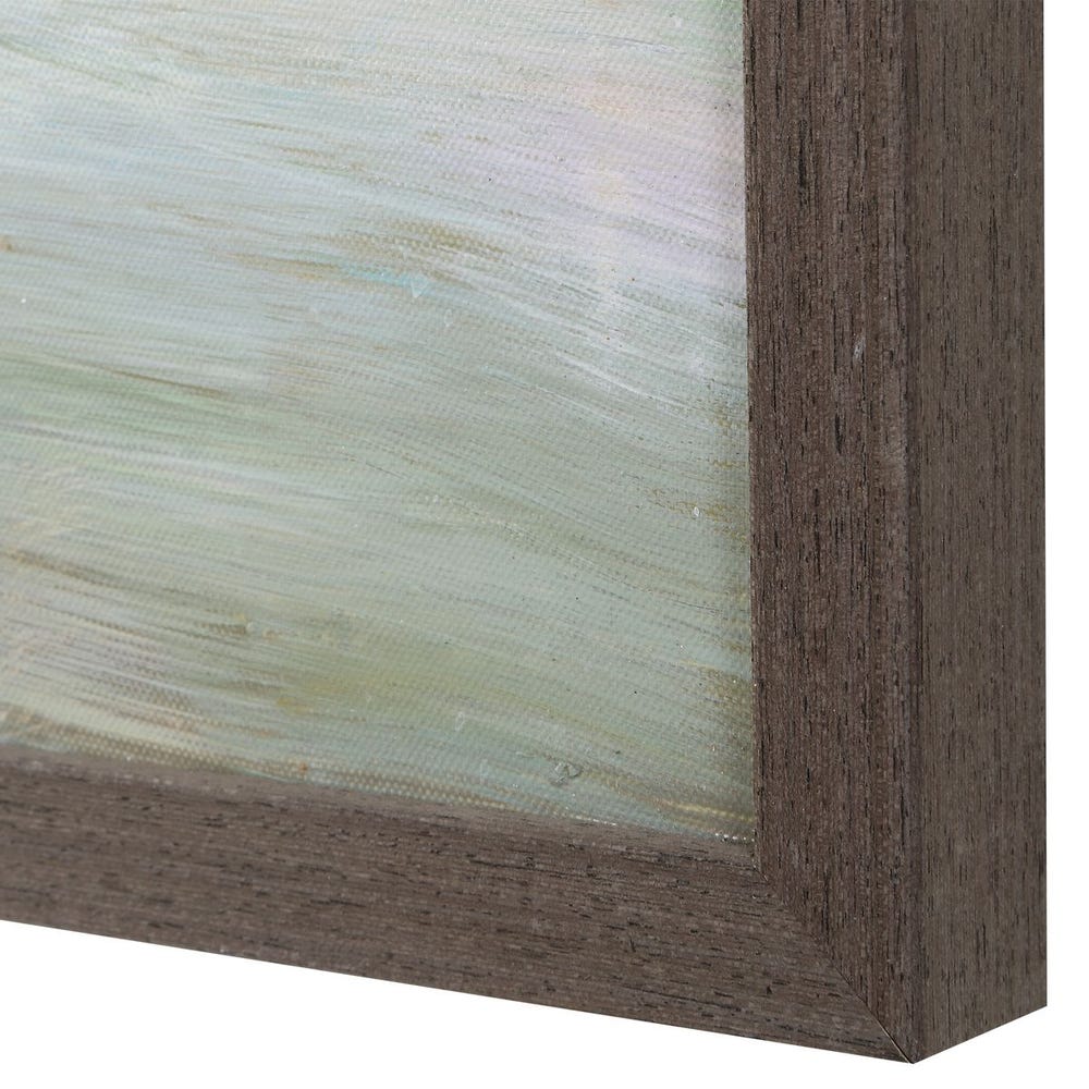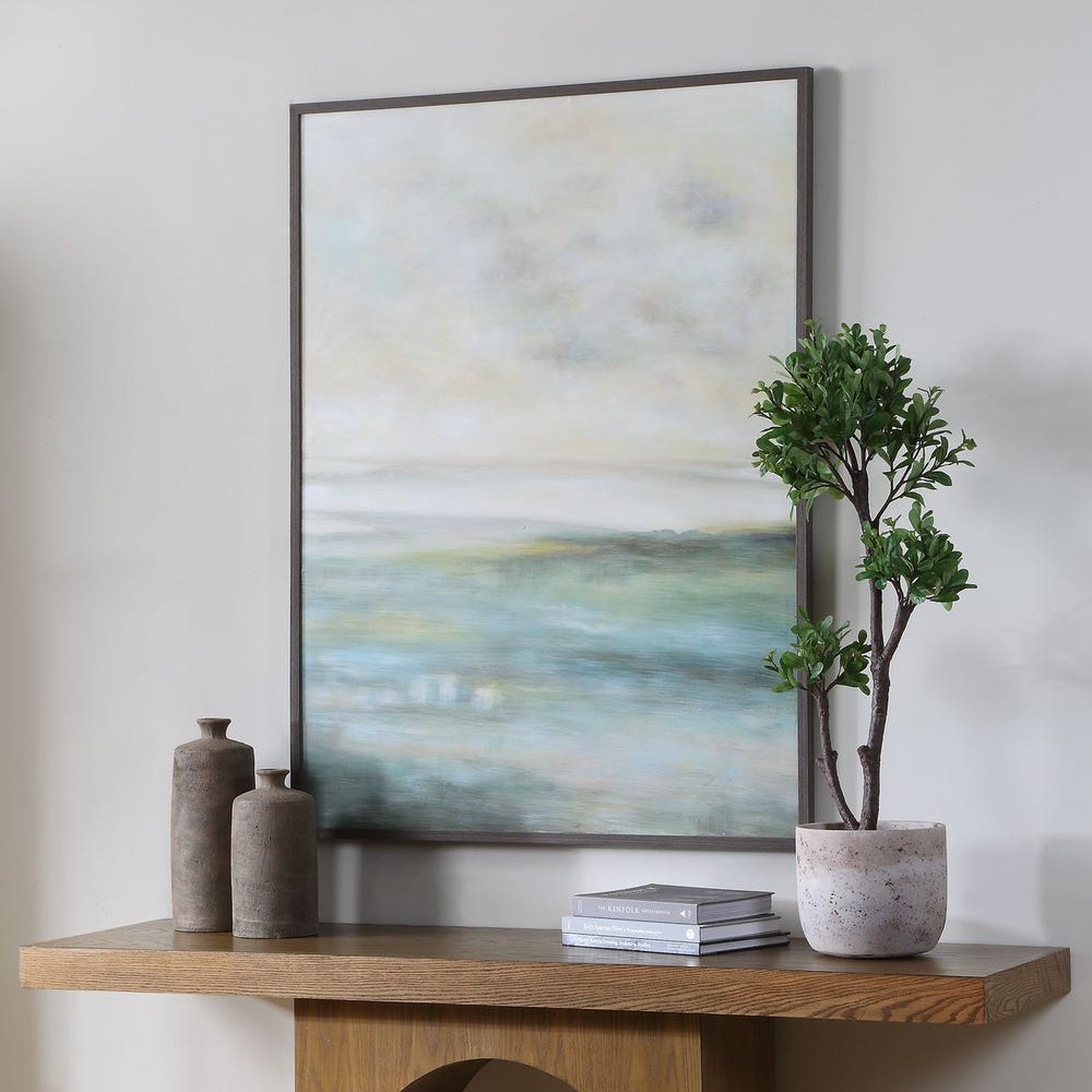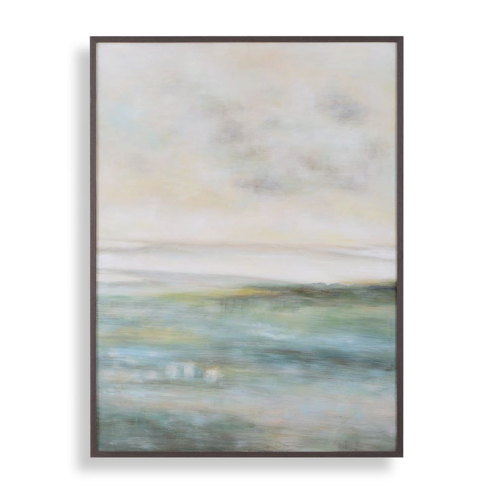 Defined by soft, atmospheric blue and green strokes with pops of yellow, this hand painted canvas offers a serene, interpretive scene, elegantly surrounded by a thin frame in a dark walnut finish. Due to the handcrafted nature of the artwork, each piece may have subtle differences.