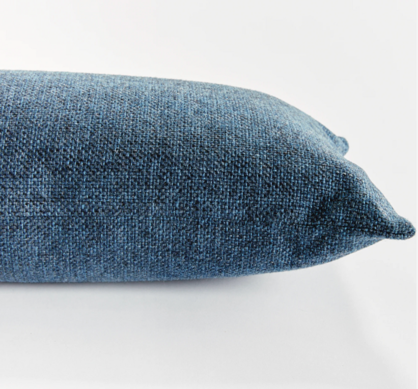 The indoor pillow that lives beautifully outdoors. Enjoy the upscale luxury and durability of Jacquard. With a woven dark blue pattern, it plays well with any palette. This pillow is weather resistant and responsibly made. Filled with 100% recycled fibers.