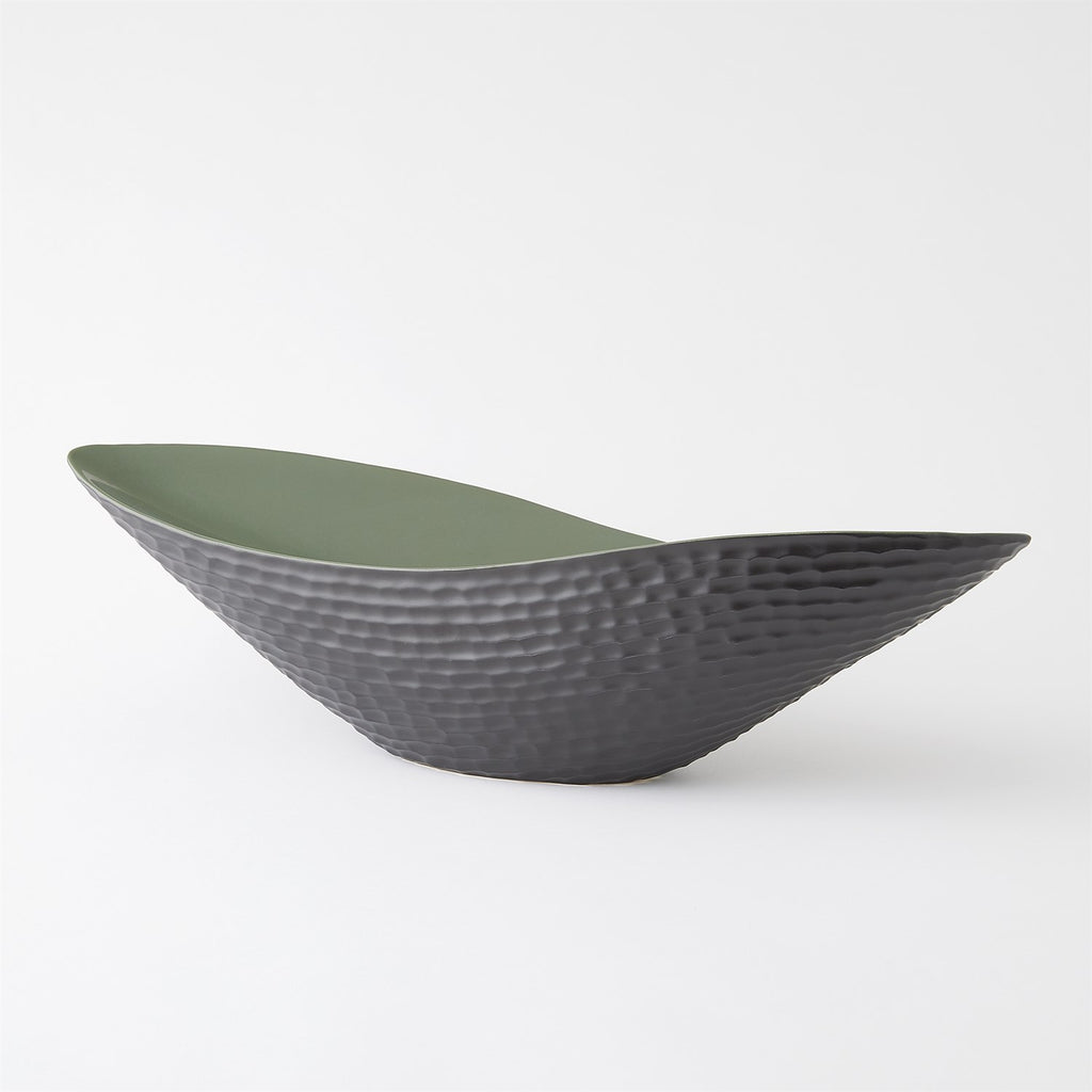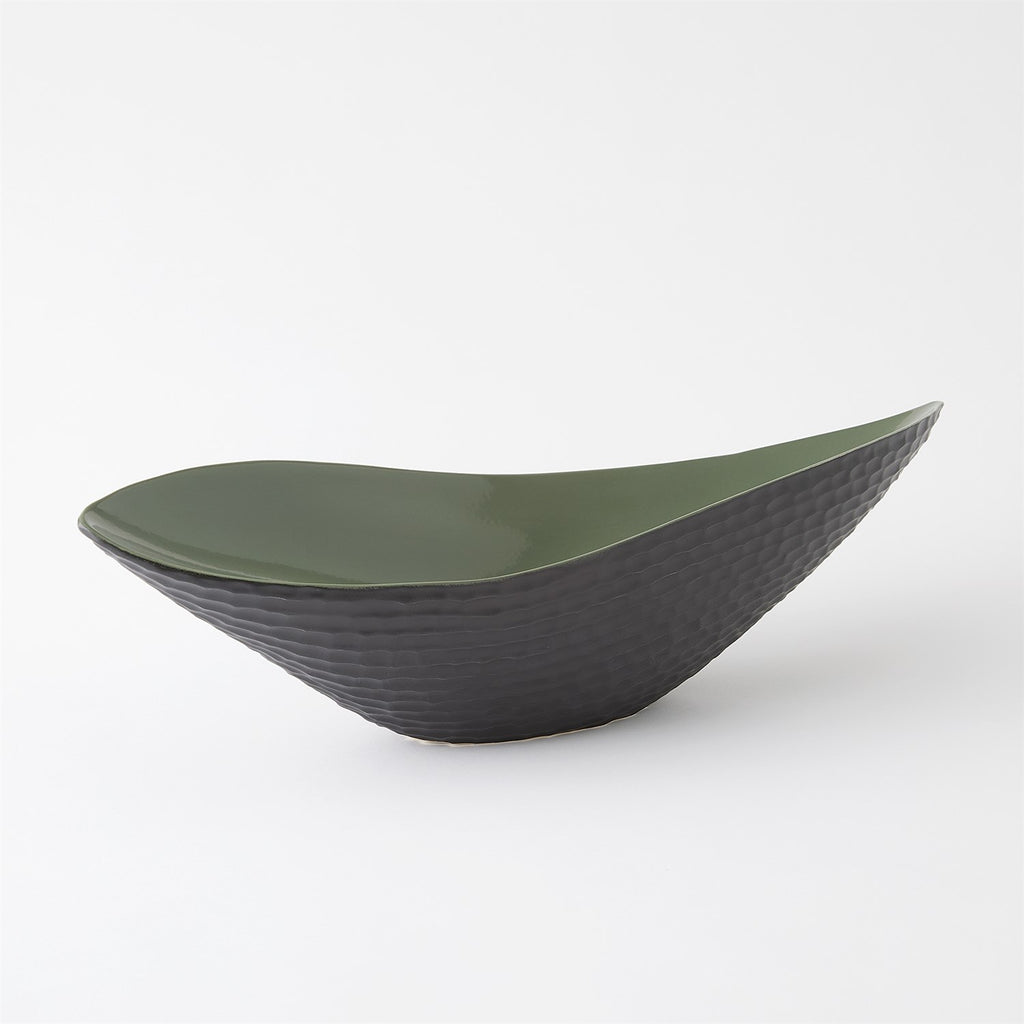 Big Bend Sexy Bowl is a classic statement piece. Its long narrow shape makes it easy to place. It is glazed with smooth blue green glaze on the inside and chiseled texture black on the outside.