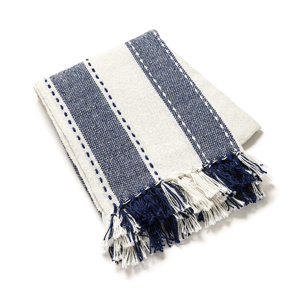 This soft outdoor throw is perfect for cozy evenings on the patio, garden gatherings, or as a stylish accent for your outdoor furniture. The design features thick stripes, handsomely lined with dashes of contrast stitching. Two-toned tassel fringe lines the edges for an added bit of luxury. Its versatile size and attractive design make it an ideal choice for adding warmth and a touch of elegance to any outdoor setting.
