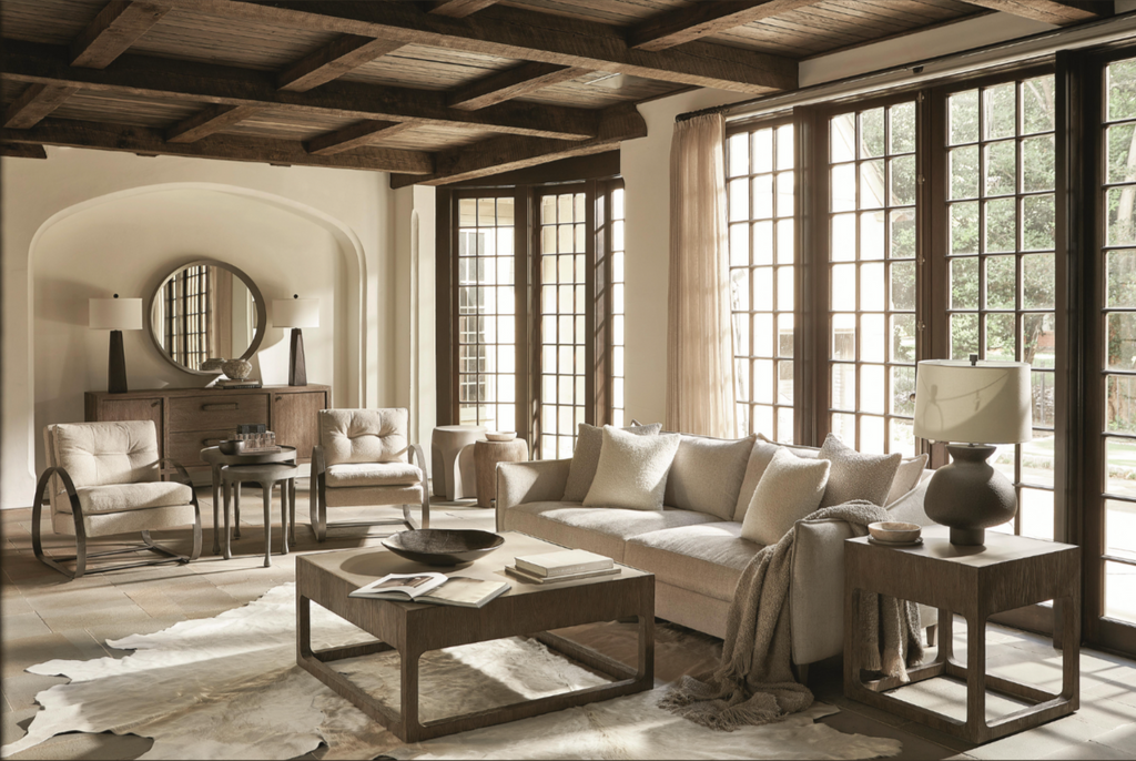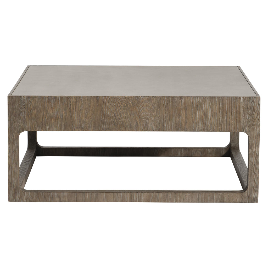There is an ageless authenticity to the Casa Paros cocktail table. It makes a bold statement with a wood frame in Playa finish and inset faux concrete top in Bedrock finish. But the unique open sides and soft shaping add the fresh originality that is a signature of this collection.