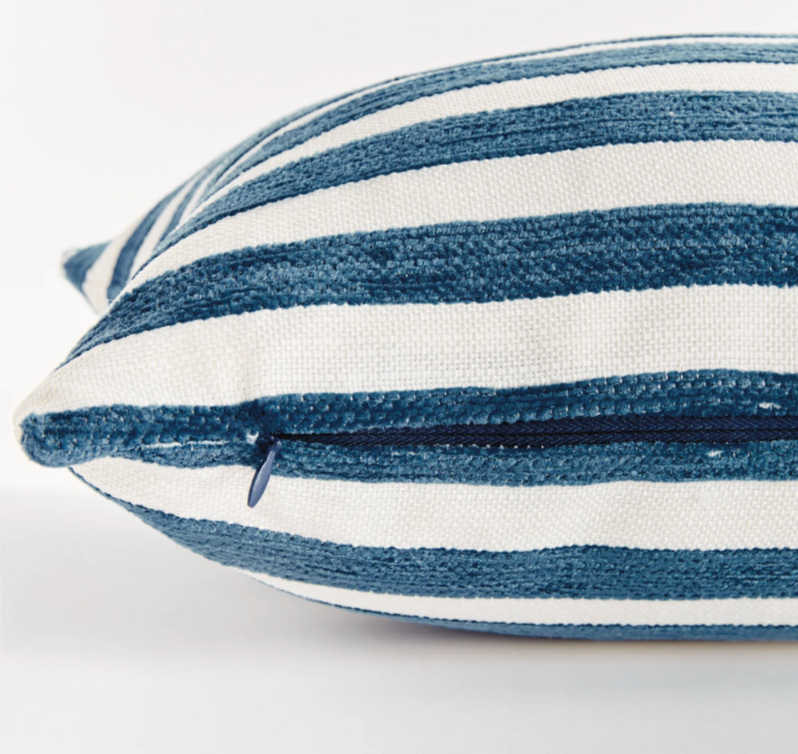 The indoor pillow that lives beautifully outdoors. Enjoy the upscale luxury and durability of Jacquard. With a bold striped pattern, it plays well with any palette. This pillow is weather resistant and responsibly made. Filled with 100% recycled fibers.