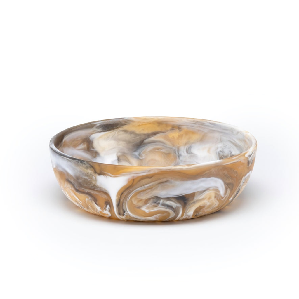 Bring joy to tabletops with Hugo-an elegant series of two-tone resin pieces in mesmerizing marbleized finishes.
