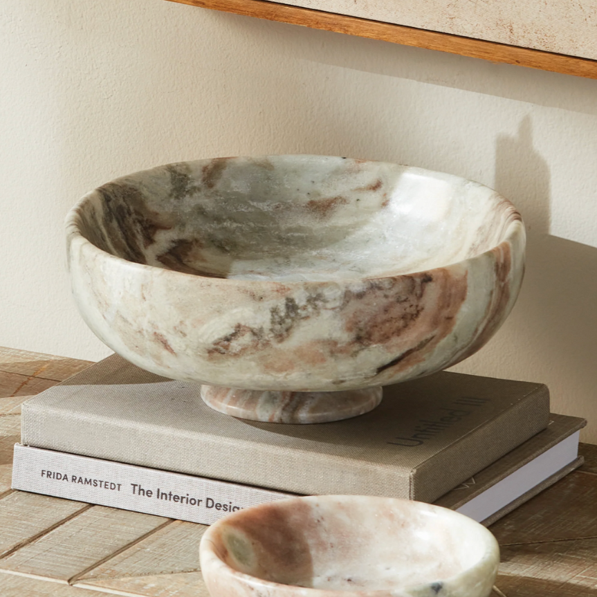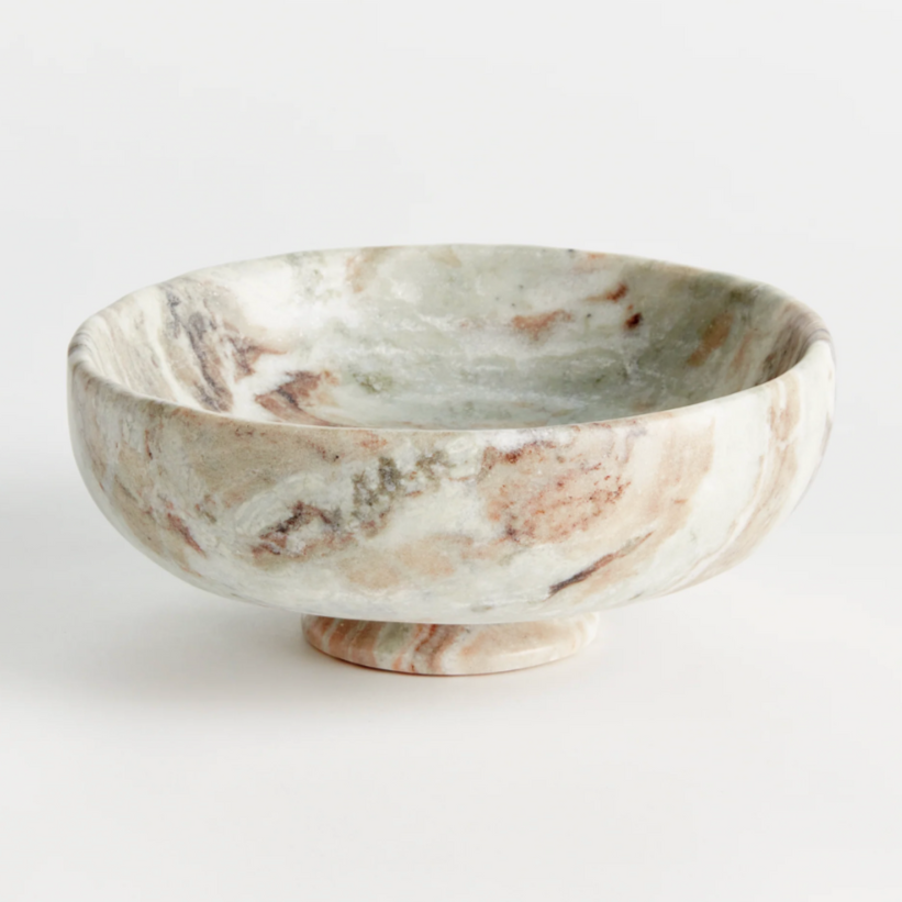 Honed to a semi-matte finish, this stunning marble is specifically known for its unique dark brown to light brown broad lines. The clay minerals found in this particular marble are what gives the simple classic footed bowl this one-of-a-kind brown veining. A beautiful accent atop home office desk, bookshelf or entry console.