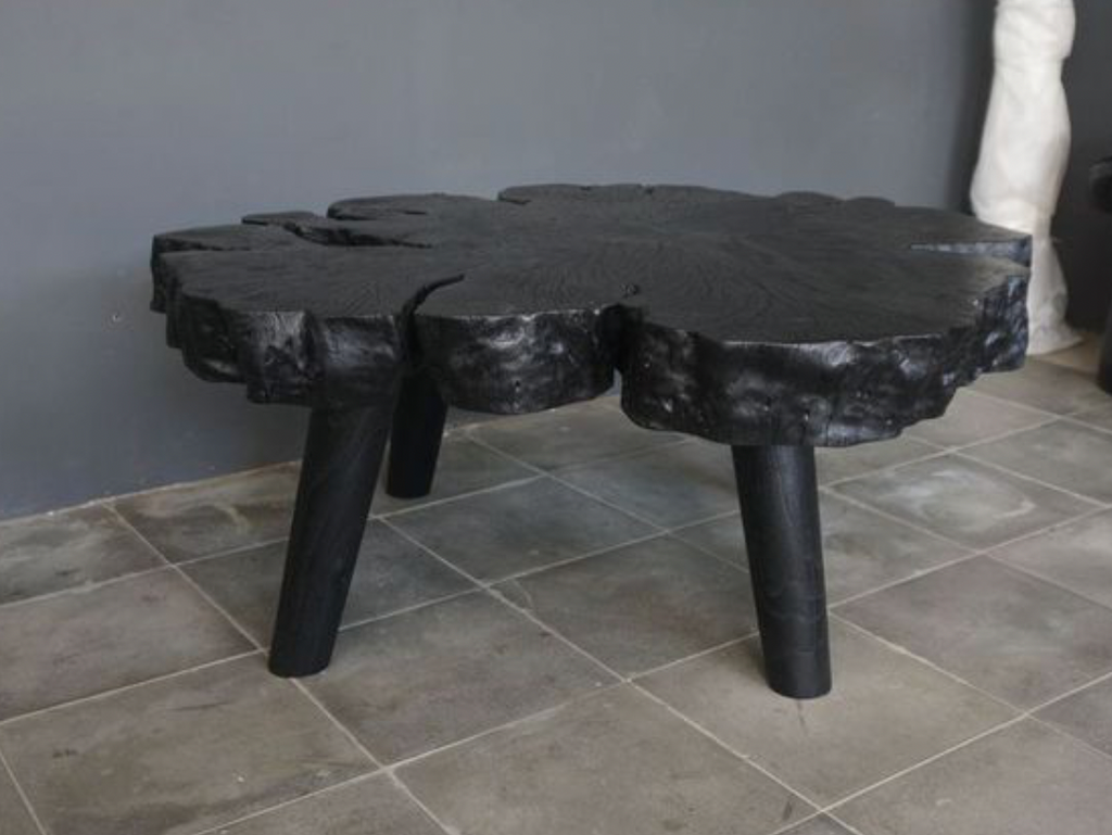 A one a kind table made with lychee wood that was harvested because the tree was no longer fruit baring .