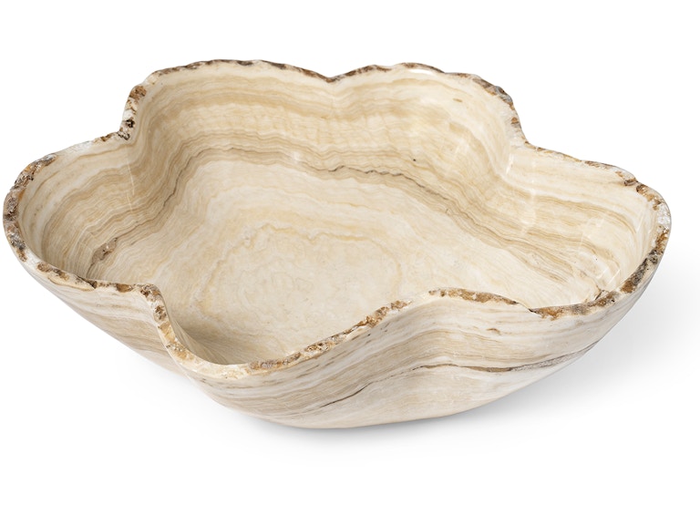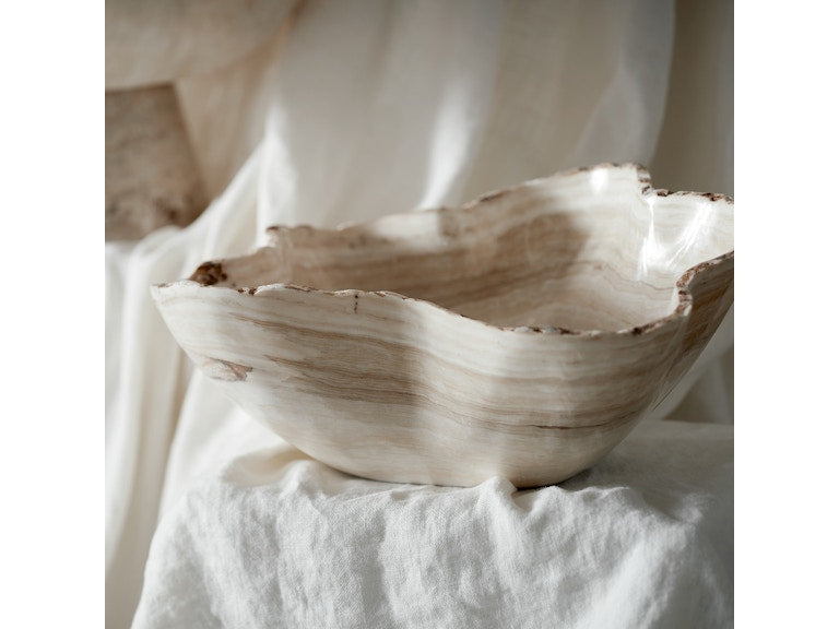 Natural onyx in a range of neutral colors, cream, beige, taupe and brown, is hand-cut, polished and shaped.