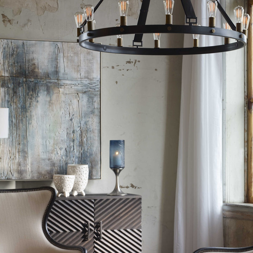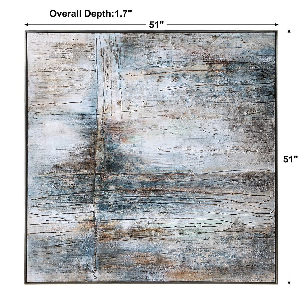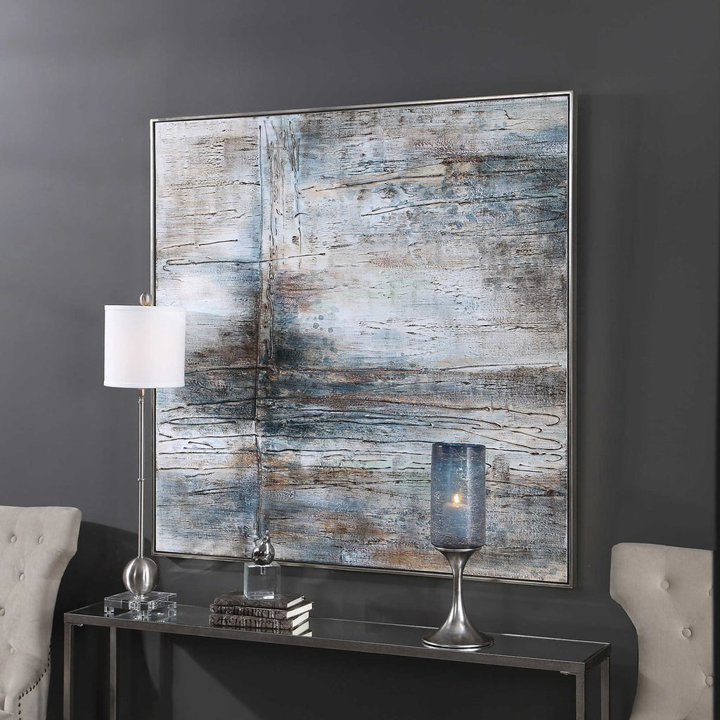 Hand painted on canvas, this abstract artwork showcases a heavily textured finish. Shades of teal, green, and light blue are accented by neutral gray, tan, and charcoal tones. An antiqued silver leaf gallery frame completes this piece. Due to the handcrafted nature of this artwork, each piece may have subtle differences. This piece may be hung horizontal or vertical.