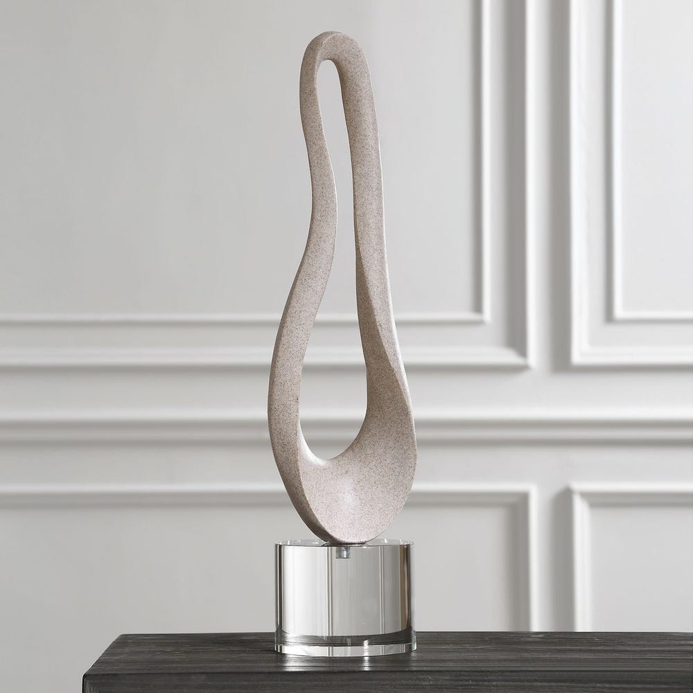 The sculpture is perched atop a crystal base, adding a touch of contemporary elegance to its timeless form. The subtle interplay of textures and colors creates a harmonious balance, inviting viewers to explore the fluid lines and organic contours that define its unique shape.