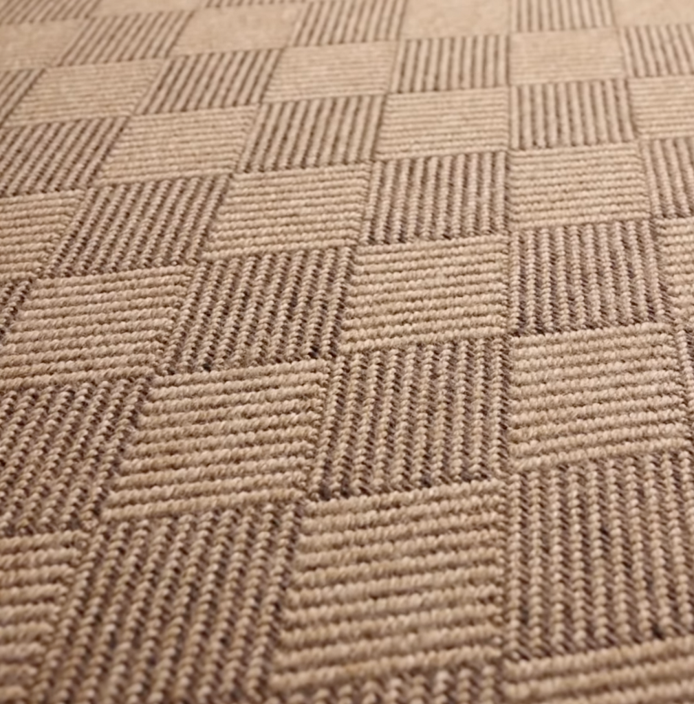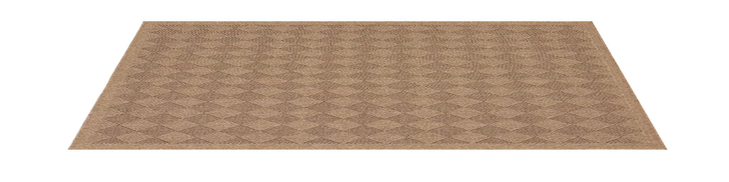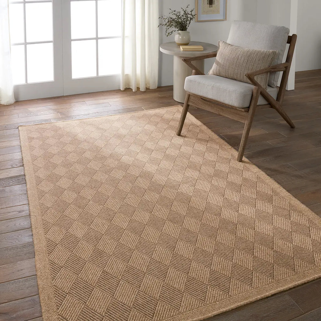 Grounding and impressively versatile, the Nambe collection features a durable, weather-resistant quality that mimics flatwoven natural looks. Emanating the classic colors of grass fibers, this assortment of indoor-outdoor rugs boasts a warm neutral palette. The Amanar rug features a checkboard design and matching border in various brown tones