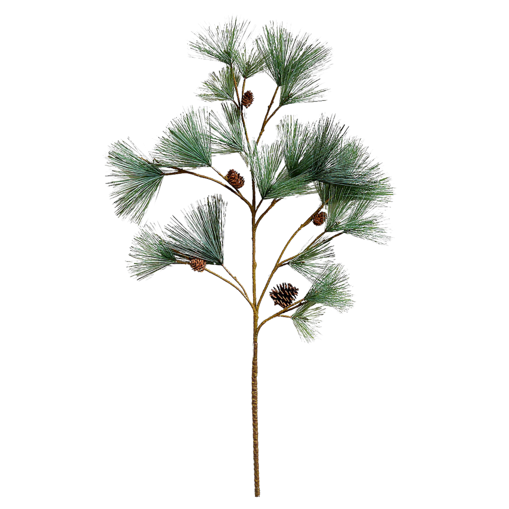 Create instant holiday ambiance with one or a handful of these faux pine stems. Recreating the feathery needles and silvery-sage color of natural pine, this lifelike stem is studded with actual pinecones for a look that's natural and organic. Lovely in a clear glass or earthenware vase, the pine stem adds seasonal greenery that lasts from year to year.