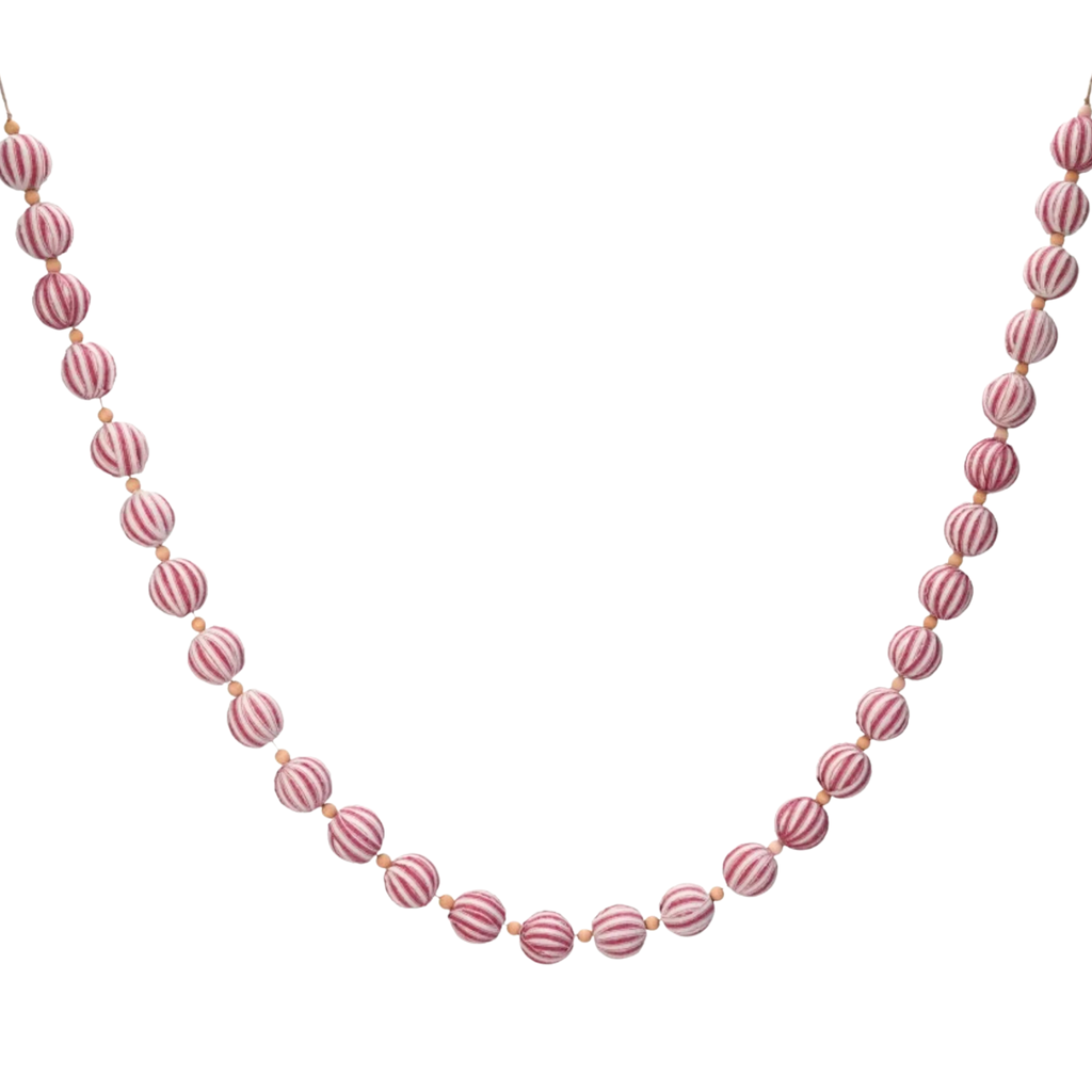 Bring a cheerful pop of color to your seasonal décor with this 72-inch red and white striped holiday ball garland accented with small wood beads. Its playful mix of festive stripes and warm, organic textures creates a charming balance between classic holiday spirit and modern design. Perfect for draping along mantels, weaving through banisters, or adding a whimsical touch to your Christmas tree, this garland is a versatile piece that brightens any space.