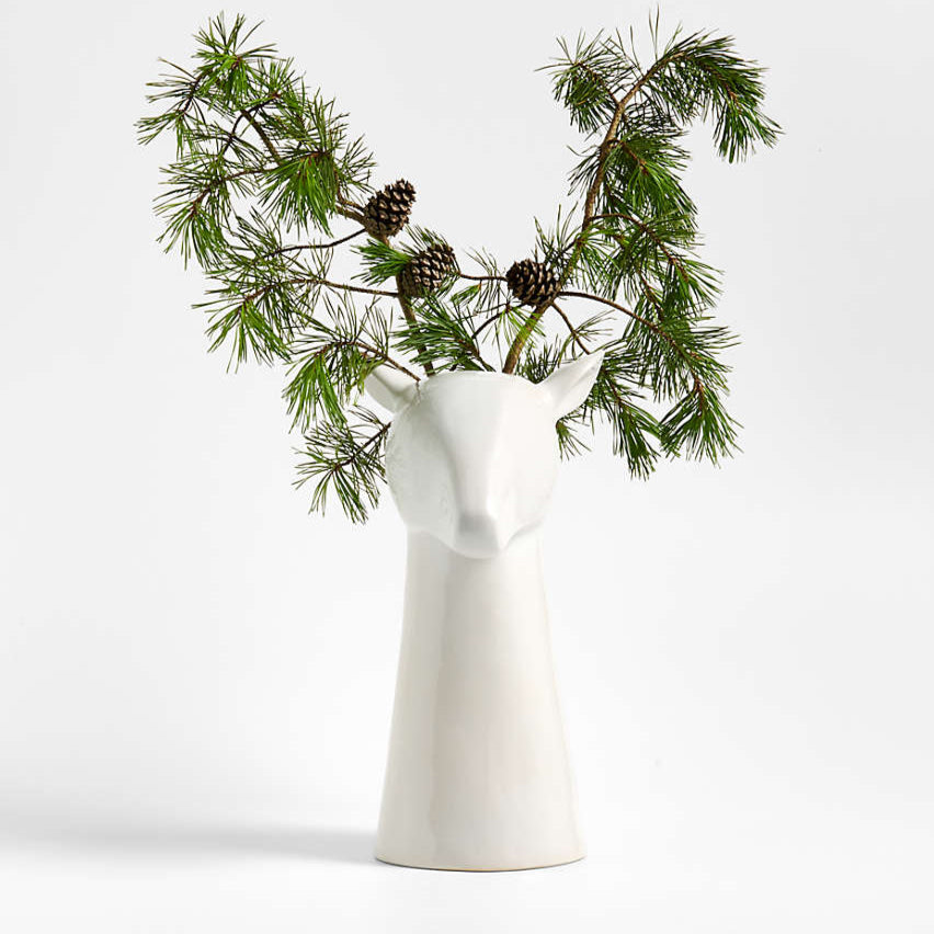 A modern and minimalist take on a winter icon, this snow-white deer delights with artisan quality and a touch of whimsy. Skilled craftspeople cast the ceramic caribou by hand, finishing it with a glossy white glaze that accentuates its streamlined look. To complete the look, add foraged branches or faux botanicals to create a unique pair of antlers.